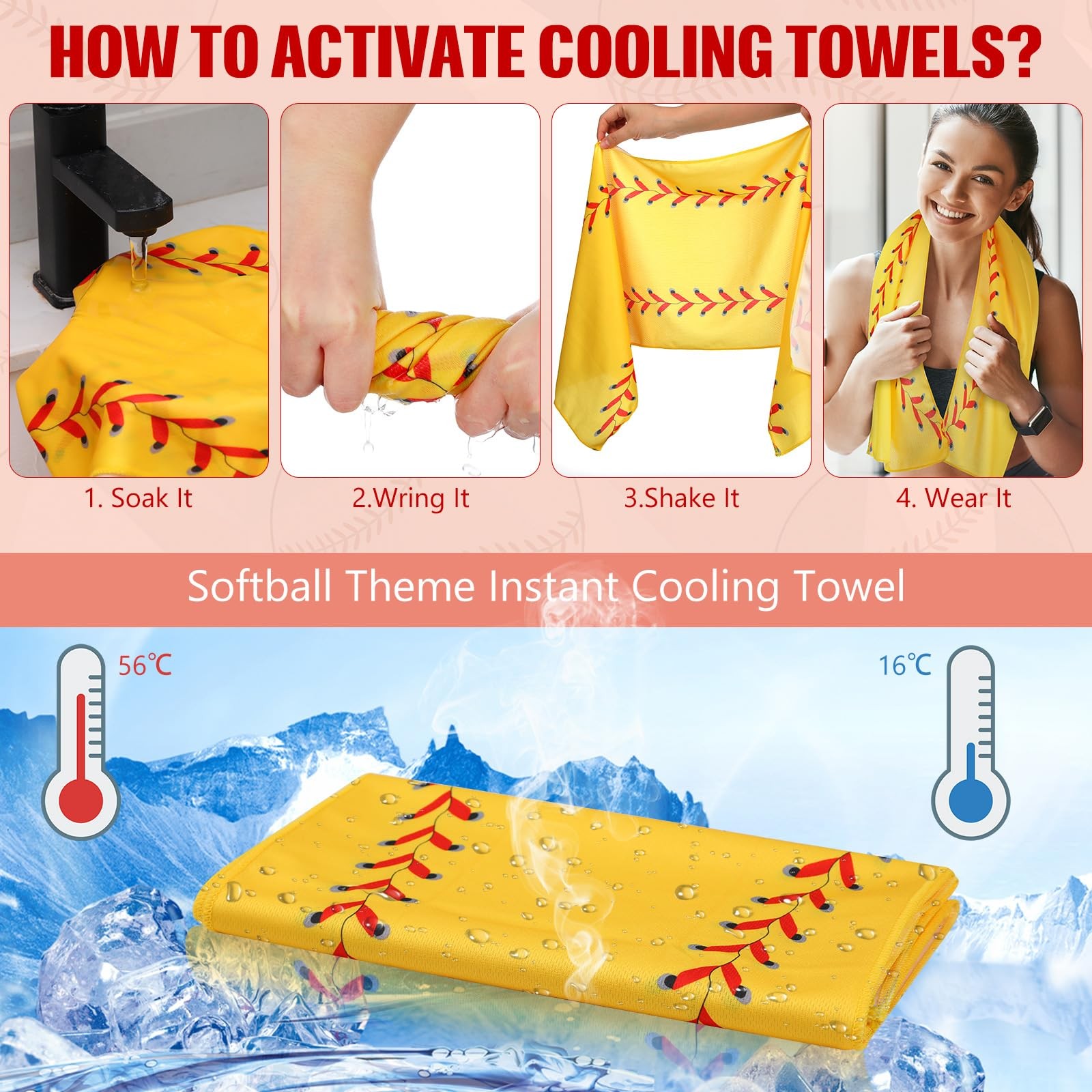 Features: The cooling exercise towel has sweat wicking properties, making them suitable for workouts, sports, or other outdoor activities. The structure of sport towel provides breathability and thereby intensifying its cooling effect, ensuring you remain comfortable and refreshed. Specifications: Material: microfiber Color: classic color Size: about 40 x 12 inch Package includes: 12 x Towels with bags Notes: Manual measurement, please allow slight errors on size. The color may exist a slight difference due to different screen displays. Convenient Package: the package includes 12 of workout towels, ensuring that you experience the comfort and coolness whenever you need; The towels also come with convenient carrying bags, helping to keep the towels easily accessible Quality Material for Cooling Effect: made from microfiber, the cooling towels bulk provides immediate relief from the heat; The use of fibers not only enhances the absorbency but also promotes quick evaporation, delivering a cooling effect that lasts for hours Proper Size for Your Needs: with a generous size of 40 x 12 inches, this softball towel provides sufficient coverage to wipe off sweat or cool down; This size is also convenient for tying around your neck or head to experience consistent cooling during intense activities Appealing Design: our gym towels come in a classic design, featuring a softball print that adds some fun and style to your workout or outdoor activities gear, ensuring you play hard and keep cool, yet look good Easy to Use: first, wet the workout sweat towels at normal temperature, twist it gently, then shake it off to achieve the cooling effect immediately; However, it should be noted that the cold sports towels are only suitable for absorbing sweat and cooling; It does not have strong water absorption capacity and cannot be applied for face washing and bathing