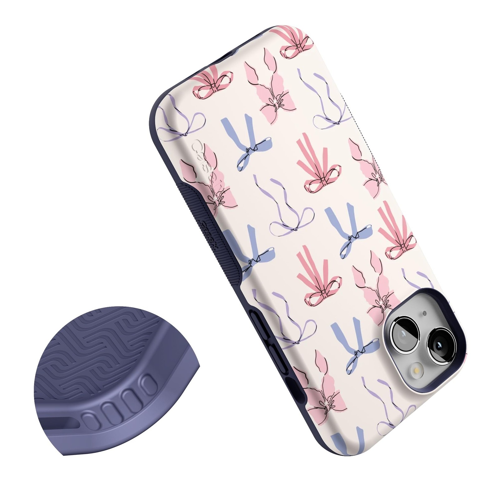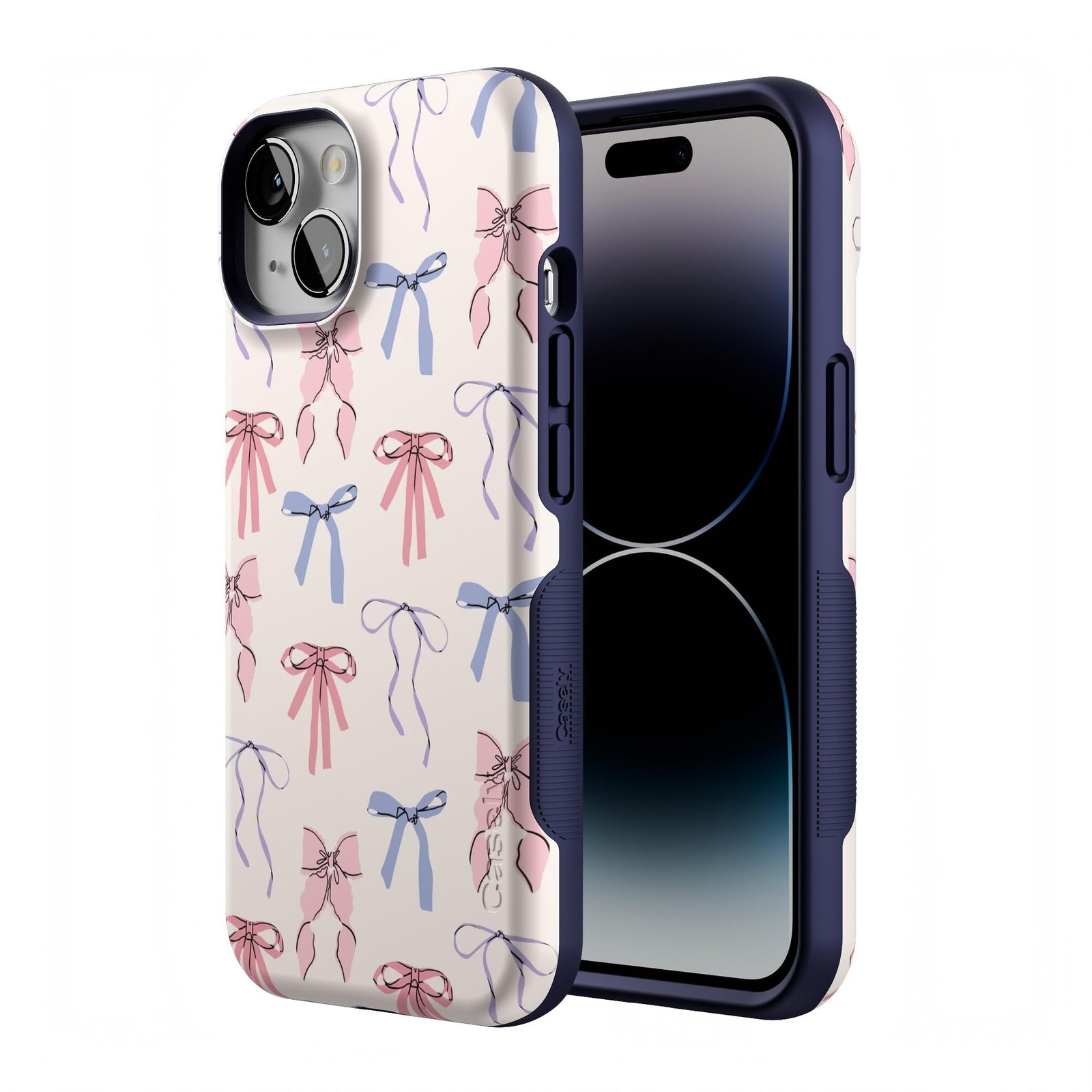 Product Page iPhone 14 Coquette Girlie Pastel Bows Case Military Grade Protection Description: Say hello to our best-selling Coquette Girlie Pastel Bows Case, the perfect accessory to add some soft, flirty vibes to your everyday style. With its playful pastel pink and blue bows, this case has that effortlessly feminine touch that's totally in right now. Whether you're taking cute selfies or just want to give your phone a stylish upgrade, this case brings all the charm and protection you need. Time to show off your sweet side with this adorable bow-covered staple! Features: Compatibility: Meet the Bold Collection - Not just a pretty cover for your phone, the Bold Collection Case from Casely is a super-strong Military-Grade-tested protective case, offering up to 8-feet of drop protection. Unique Features: Slip Resistant Side Grips. Stop drops in their tracks. Textured side grips help your phone firmly in your hand. Lightweight for Those on the Go: Don't carry a dumbbell around in your pocket. Ultra sleek, ultra slim. 3mm raised front lip protection. Weight: 1 Ounce. Protection: Shock absorbing air pocket technology cushions your phone from drops of up to 8 feet. Camera Protection: 1.5 mm raised lip keeps your camera safe from contact. Snap Crystal-clear pics every time. Charge Wirelessly: Go wireless. All Bold cases are wireless charging compatible. Designed in USA: Casely is one of very few case companies that designs our cases in the USA; All of our Phone Cases are designed in our Brooklyn, New York Headquarters Our Philosophy: We build protection for your Boldest behavior. #LiveBold. Casely's products are made with love and hand inspected from corner to corner to ensure high-quality phone cases you can count on. All cases come with a 1-year product warranty.