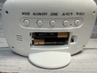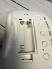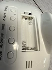 This is a cordless atomic digital alarm clocks with blue backlit LCD displays. Mint pre-owned condition - tested and working. Excellent cosmetic condition. Requires 2 AAA batteries for power. The clock measures approximately 5-1/8" wide x 3-1/2" tall x 2-/4" depth. Features an easy to read 1" tall clock digits and show the time zone, day and date along with the indoor room temperature. There is a blue LED backlight for checking the time in the dark. Please see pictures for more information. Thank you for looking. Have a great day.