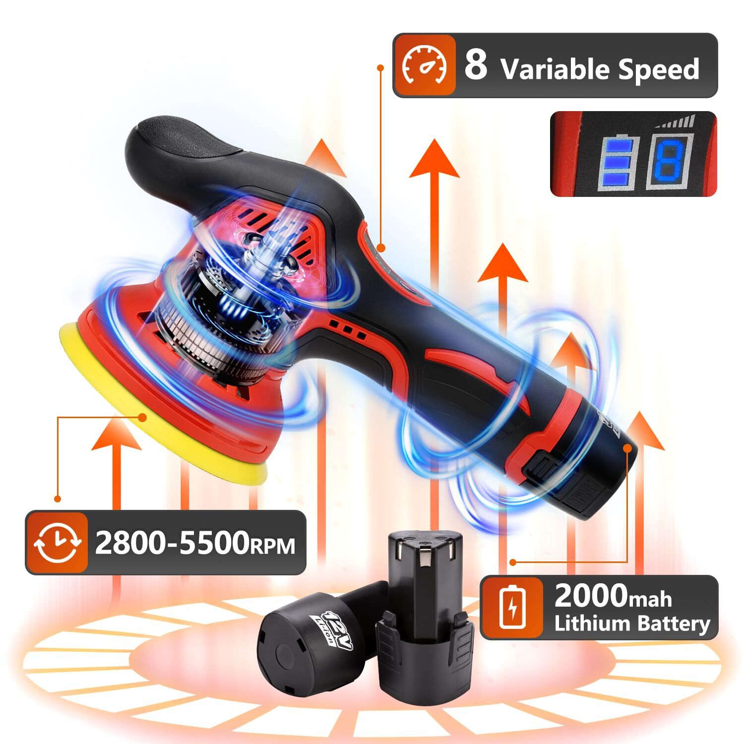 Product Parameter: 5-inch diameter (it can be replaced with a 6-inch polishing disc by using a flat 24mm opening hand wrench), 8 variable speeds, 2000mAh battery capacity, 2800-5500r/min no-load speed, 12V voltage, 280W working power, 12mm rccentric distance, 2.6 pounds weight Powerful Performance: Equipped with a mighty 2000mAh lithium battery, charging is simple and economical. This polisher ensures you have ample power to tackle the most exquisite car detailing jobs 8-Speed Control: The maximum speed can be manually adjusted to 8 levels, up to 2500-5500rpm. You can choose the appropriate speed according to different usage scenarios. It is an ideal polishing tool for polishing/waxing/buffering well, refresh your car Portable and Lightweight: Only 2.6 pounds light weight. This cordless car buffer polisher is not limited by cables, just plug in the battery and you can use it anywhere. Apart from that, the ergonomic design of the cordless car buffer provides comfortable operation, enabling you to work for long hours without discomfort What You Will Get: Buffer Polisher x1 ; Battery x2 ; Charger x1 ; Flat Sponge Pad x2 ; Wave Sponge Pad x2 ; Wool Wheel Pad x2 ; Cotton Towel Polishing Cover x5 ; Sandpaper x3 ; Waterproof Apron x1
