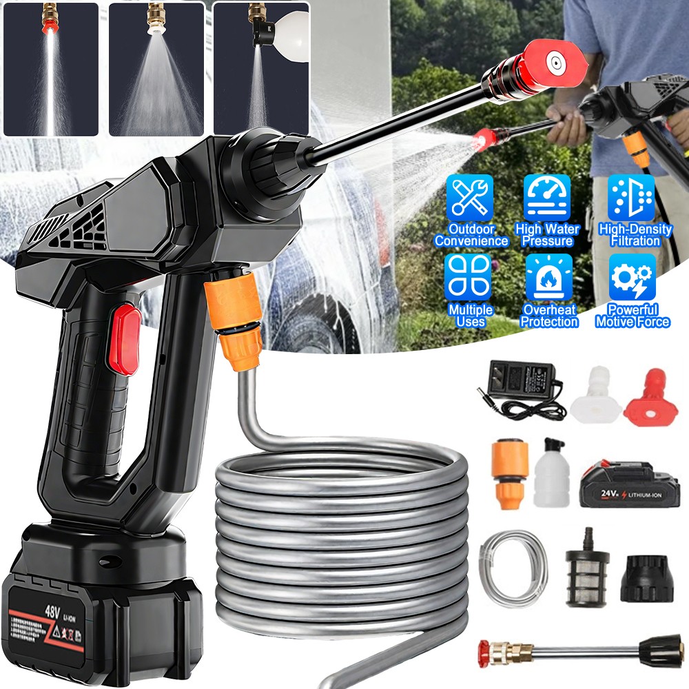 Note: 2 types you can chocie what you want Tyep A Product Description: 1. Effective cleaning. Our battery powered cordless high-pressure cleaning machine has a triple watering system. In addition, we also provide nozzles with cleaning agent containers that can be used for daily cleaning. The provided high/low pressure nozzles and 400ml mixing containers can be widely used for cleaning vehicles, bicycles, boats, windows, and lanes. 2. Portable pressure cleaners use high-performance batteries to provide long-lasting power and reliable performance. This battery is rechargeable and compatible with various power tools, allowing you to use the high-pressure cleaning machine for up to 30 minutes on a single charge. 3. This 16.4-foot (5M) hose with a filter basket on the water gun can effectively filter impurities, particles, waste leaves, or sludge, better protecting our press. Moreover, high-quality water pipes are pressure resistant and durable, ensuring long-term use and not easily worn out. 4. Portable high-pressure cleaning machine, equipped with a 300W motor, maximum water pressure of 435 PSI, and flow rate of 8L/Min. Powerful enough to achieve efficient and fast cleaning. The body is made of special materials for waterproofing, making water and electricity isolation safer. It also has a temperature protection function, which automatically shuts down over temperature and overload, eliminating safety hazards. F or your convenience, we provide elegant and practical suitcases to store and carry high-pressure water guns and their accessories. With a sturdy outer shell design and customized internal compartments, all components can be safely stored. You can easily bring the water gun anywhere, ensuring a clean and worry free environment. Product parameters Voltage: 48v Power: 300w Water output: 8L/min Usage time: 30 minutes Battery charging time: 3-4 hours Spray distance: 6-8 meters Working pressure: 30bar Empty speed: 18000PRM Product List: 1 * Water gun barrel 1. Clean the water pipe 1 * Adjusting the nozzle 1 * Charger 1 * Inlet pipe adapter 2 * Battery 1 * Filter screen 1 * foam kettle 1 * Spray nozzle 1 * Toolbox Ty pe B Product list: 1 * Water gun body, 1 * Cleaning water pipe, 1 * Adjusting nozzle, 1 * Charger, 1 * Inlet pipe adapter, 2 * Battery, 1 * Filter screen, 1 * foam kettle, 1 * Spray pipe, 1 * Toolbox Features : Voltage: 21V Power: 300W Water output: 8L/minute Usage time: 30 minutes Battery charging time: 3-4 hours Spray distance: 6-8 meters Work pressure: 30bar Idle speed: 18000PRM Descr iption : 1. Effective cleaning. Our battery powered cordless high-voltage cleaning machine has a triple watering system. In addition, we also provide nozzles with cleaning agent containers that can be used for daily cleaning. The provided high/low pressure nozzle and 400ml mixing container can be widely used for cleaning vehicles, bicycles, boats, windows, and lanes. 2. The portable pressure cleaner uses high-performance batteries to provide long-lasting power and reliable performance. This battery is rechargeable and compatible with various power tools, allowing you to use the high-pressure cleaner for up to 30 minutes on a single charge. 3. The 16.4-foot (5M) hose with filter basket of this water gun can effectively filter impurities, particles, waste leaves or sludge, better protecting our press. Moreover, high-quality water pipes are pressure resistant and durable, ensuring long-term use and resistance to wear and tear. 4. Portable high-pressure cleaning machine, equipped with a 300W motor, maximum water pressure of 435 PSI, and flow rate of 8L/Min. Powerful enough to achieve efficient and fast cleaning. The body is made of special materials for waterproofing, and the water and electricity isolation is safer. It also has temperature protection function, automatic shutdown for overheating and overload, eliminating safety hazards. For your convenience, we provide elegant and practical suitcases to store and carry high-pressure water guns and their accessories. With a sturdy shell design and customized internal compartments, all components can be safely stored. You can easily take the water gun anywhere, ensuring a clean and worry free environment.