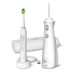 2-IN-1 ORAL CARE KIT: Waterpik Cordless Pearl and Sensonic electric toothbrush is a perfect combo to help you maintain healthier gums and cleaner teeth whether you are at home or on the go. Both products include rechargeable batteries and portable design. WATER FLOSSER FEATURES: 1 tip, 2 safe and effective pressure settings, 7oz removable reservoir (top-rack dishwasher safe) for up to 45 secs floss time, NiMH battery, and 360 tip rotation. Not for use in the shower. ELECTRIC TOOTHBRUSH FEATURES: Rechargeable lithium-ion battery lasts up to 4 weeks per charge, 2-minute timer with 30-second pacer, recharge indicator, 3 modes, ADA-compliant soft bristles, ultra-quiet technology, ergonomic handle with non-slip finish. DENTIST RECOMMENDED: Waterpik is the #1 water flosser brand recommended by dental professionals and both products have earned the American Dental Association (ADA) Seal of Acceptance for safety and effectiveness. INCLUDED: Cordless water flosser, electric toothbrush, 1 Precision Jet Tip (JT-450E), 1 Sensonic Contour Brush Head (STWB-3WW-B), premium toothbrush travel case, toothbrush charging base, 2 USB charging cables (require USB-A wall adapter, not included) Experience a deeper clean that you can see and feel with the Waterpik Cordless Pearl and Sensonic Rechargeable Electric Toothbrush and Water Flosser Combo pack. The electric toothbrush has soft bristles that provide a gentle, yet effective clean, and are specially designed to clean hard-to-reach areas, even back teeth. It features a lightweight and ultra-quiet design, an ergonomic handle with a non-slip finish, a 2-minute timer with 30-second pacer, and a rechargeable lithium-ion battery that lasts up to 4 weeks per charge. Personalize your brushing with 3 modes: clean, stain removal, and gum care. Rechargeable and portable, the Cordless Pearl water flosser is perfect for smaller bathrooms and travel. It features an ultra-quiet design, an ergonomic narrow hand grip, 2 pressure settings, and a removable water reservoir with up to 45 seconds of flossing time. The special 360-degree rotating tip handle easily reaches your whole mouth, even back teeth.