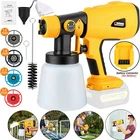 Features: Cordless Paint Sprayer By Battery: The cordless paint sprayer is Compatible with DEWALT 20V Battery DCB203 DCB204 DCB205 DCB206 DCBP034 DCB606 DCB609 etc (Battery NOT Included).Enjoy the convenience of outdoor operation without being limited by wires. 3 Spray patterns & 4 nozzle:360 ° rotation, precise control of spray painting area, and flexible rotation for multi angle spraying,There are three different spraying modes: horizontal, vertical, and circular spray patterns. The machine is equipped with four nozzle sizes (1.0mm, 1.8mm, and 3.0mm), which are placed in the box. The machine comes with a pre-installed 2.5mm nozzle. Wide Applications:Allows you to spray a variety of projects such as interiors and exteriors, crafts, walls, ceilings, furniture, fences, cabinets, floors, cabinets, home furniture. Adjustable Design:The spray width can be adjusted according to your heart, and rotating left and right can change the spray width,Rotable flow control valve to control atomized particles and flow size, saving costs. Powerful Motor:High power brushless motor, easy to spray latex paint, even and delicate for long-term use without burning the machine, handheld paint sprayer flow rate is 160L /min, control valve knob to adjust the thickness of the paint output to adjust the flow rate. Specification: Input voltage: 20V Output power: 200W Spray foot distance: 200-250mm Motor speed: 39000RPM/MIN Air flow rate: 160L/MIN Spray width: 200-300mm Note:Only Compatible with DEWALT 20V Max Battery(Battery not included) Package Included: 1*Cordless Paint Sprayer 4*Size Nozzles 1*Cleaning Brush 1*Viscosity cup 6*Paint Filter