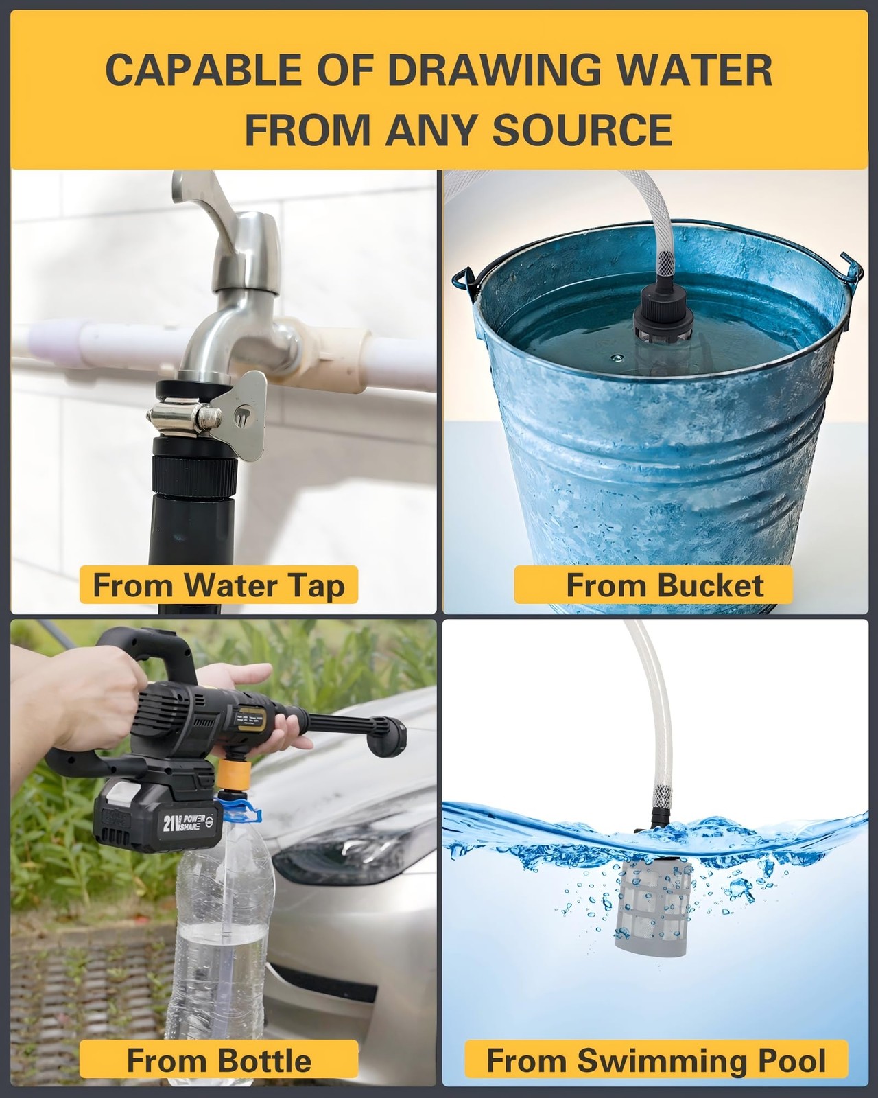 cordless pressure washer portable pressure washer cordless power washer battery powered pressure washer portable pressure washer cordless indoor pressure washer battery pressure washer power stream pressure washer cordless pressure washers portable cordless pressure washer cordless pressure washer battery powered handheld pressure washer car pressure washer battery powered power washer pressure washer battery powered hidrolavadora portatil pressure washer cordless portable power washer cordless battery operated power washer hand held pressure washer hand held power washer cordless portable pressure washer battery power washer cordless car detailing pressure washer cordless power washer portable small pressure washer portable portable water tank with hose compact pressure washer mini power washer power washer portable small power washer portable pressure washer small Powerful Portable Cordless Pressure Washer: With a brushless copper motor delivers 1200 PSI, battery powered cordless power washer can tackle even the toughest dirt with ease. The weighted filter & garden-hose/tap adapters can draw water from any sources. Portable yet powerful, with quick-connects and a soft case, battery operated pressure washer sets up fast, goes wherever needed and gets jobs done easily. Our battery powered cordless pressure washer is great for any tasks. StormForce 1200 PSI Brushless Motor: Driven by an upgraded 3820 pure-copper brushless motor, this 400 W cordless car wash portable pressure washer delivers 1200 PSI —over ten times the pressure of a standard hose. The integrated LCD control panel of our battery pressure washer cordless offers three precisely calibrated modes, letting you dial in gentle rinse or deep-scrub force on demand, dealing with everything from windows, cars, to bricks. 4.0 Ah 21 V high-performance Battery: The high-capacity battery pack in our portable pressure washer cordless pumps a steady 21 V for 30–40 min of uninterrupted wash time—plenty to soap, scrub and rinse an SUV or patio in one go. Smart Battery Management System of our handheld power washer keeps current stable, prevents heat build-up, and preserves battery life. A full recharge of our power stream pressure washer battery takes just 4 hours. Upgraded 6-in-1 Nozzle + Foam Cannon: Our reinforced 6-in-1 head of our portable battery pressure washer snaps between 0°, 15°, 25°, 40°, jet and shower for perfect coverage. Attach the foam cannon of our mini pressure washer to spray dense foam on dirt, then switch back 6-in-1 nozzle for our battery power washer to rinse clean. Whether cleaning dirt off SUVs, washing bikes, shining windows, scrubbing walls, patios or driveways, this combo tackles every job and strips away stubborn grime. Reach-Anywhere 23-ft Sturdy Hose: Allowing you to clean much wider areas, our 23-ft sturdy hose of our pressure cleaner outranges the standard 16-ft lines shipped with rival washers, so you can power wash and blast patios, cars, and upper windows without shifting the base. Made from thick, high-elastic polymer, it resists kinks and stays pliable in 124 °F heat, -4 °F cold, or pouring rain. All-season, all-weather, all-environment—an all-rounder you can trust. Draw Water Easily from Any Sources: Our water pressure washer comes with a weighted, intake filter that dives fast and screens grit, leaves and sand, pumping clean water straight from rivers, creeks, pools or a five-gallon bucket. When a faucet or garden hose is handy, clip on the included NPT, GHT or slip-on rubber collar in our car wash machine kit and snap into any garden hose or smooth outdoor tap in seconds. You’ll always find a water supply with accessories in our battery power washer. Lightweight Portable Yet Mighty: Lightweight yet mighty, our compact handheld pressure washer weighs under 4 lbs and is stored in a water-proof soft case—no bulky frame, no tangled electric cords. You can bring it everywhere—store it in the car trunk, keep it on hand for outdoor jobs, or pack it for the campsite, achieving both portable convenience and mighty power. With our detailed user manual guide, you could put everything together in few minutes and start washing already. What is included: Cordless High Pressure Washer, 4.0Ah Battery, Fast Charger, 6-in-1 Nozzle, Foam Pot, Stop Valve, 23FT Extended Extra-strong Hose, Hose Clip, NPT Garden Hose Adapter, GHT Garden Hose Adapter, Slip-on Rubber Faucet Connector, Weighted Filter, Bottle Connector, Bottle Straw, Storage Case, Detailed User Manual, 24-hour response cus-tomer service. Your Satisfaction, Our Commitment We stand by the quality of our small pressure washer with a comprehensive one year wa-rra-nty. Have questions or need assistance? We're here for you 24/7 and guarantee a professional response within 24 hours to address any concerns promptly and effectively. Your satisfaction for our car power washer is our top priority.