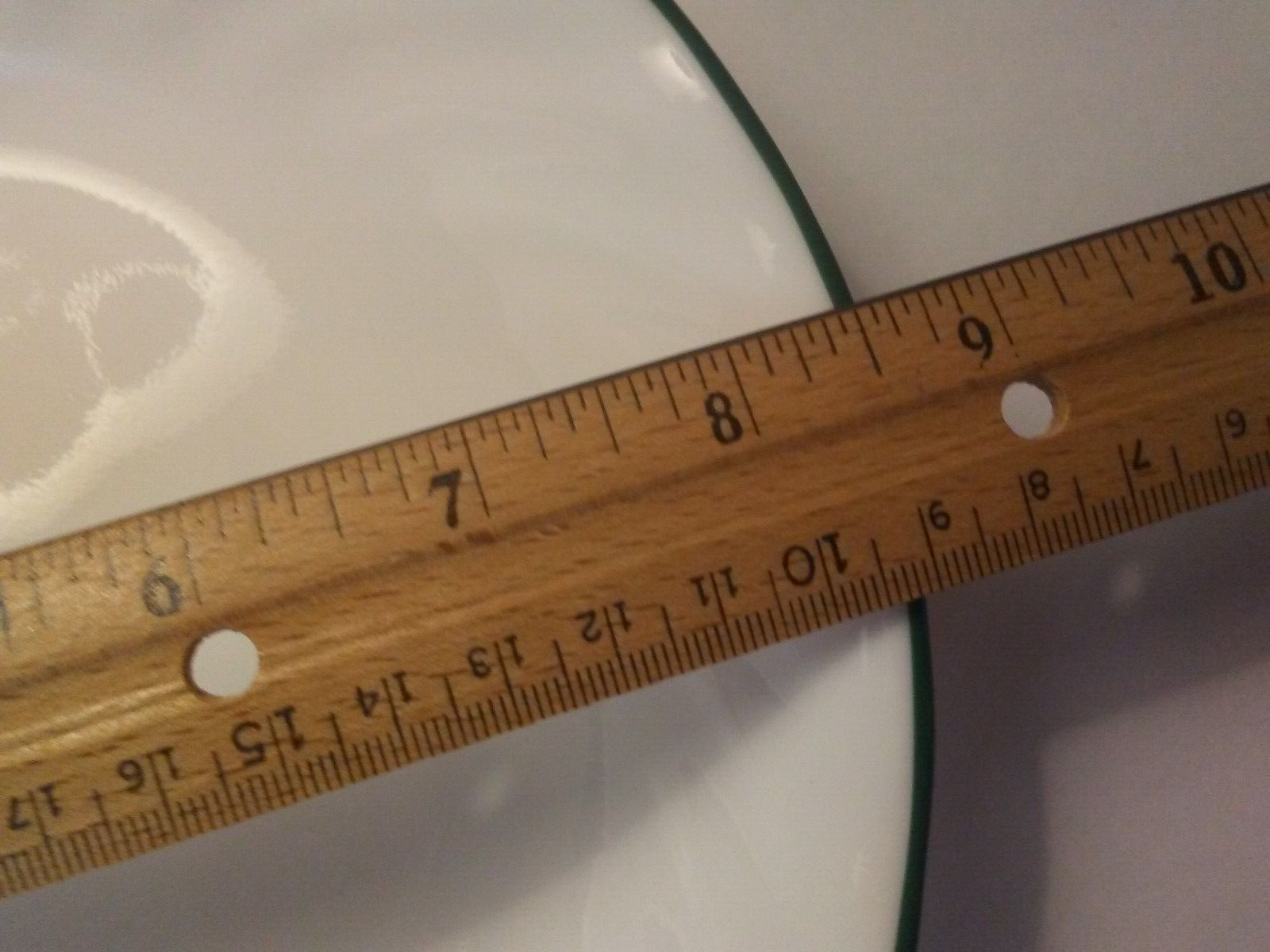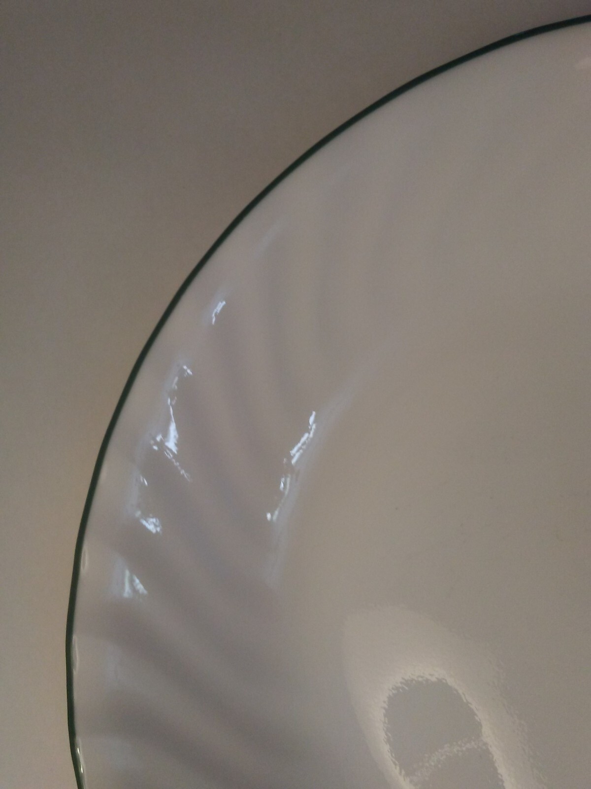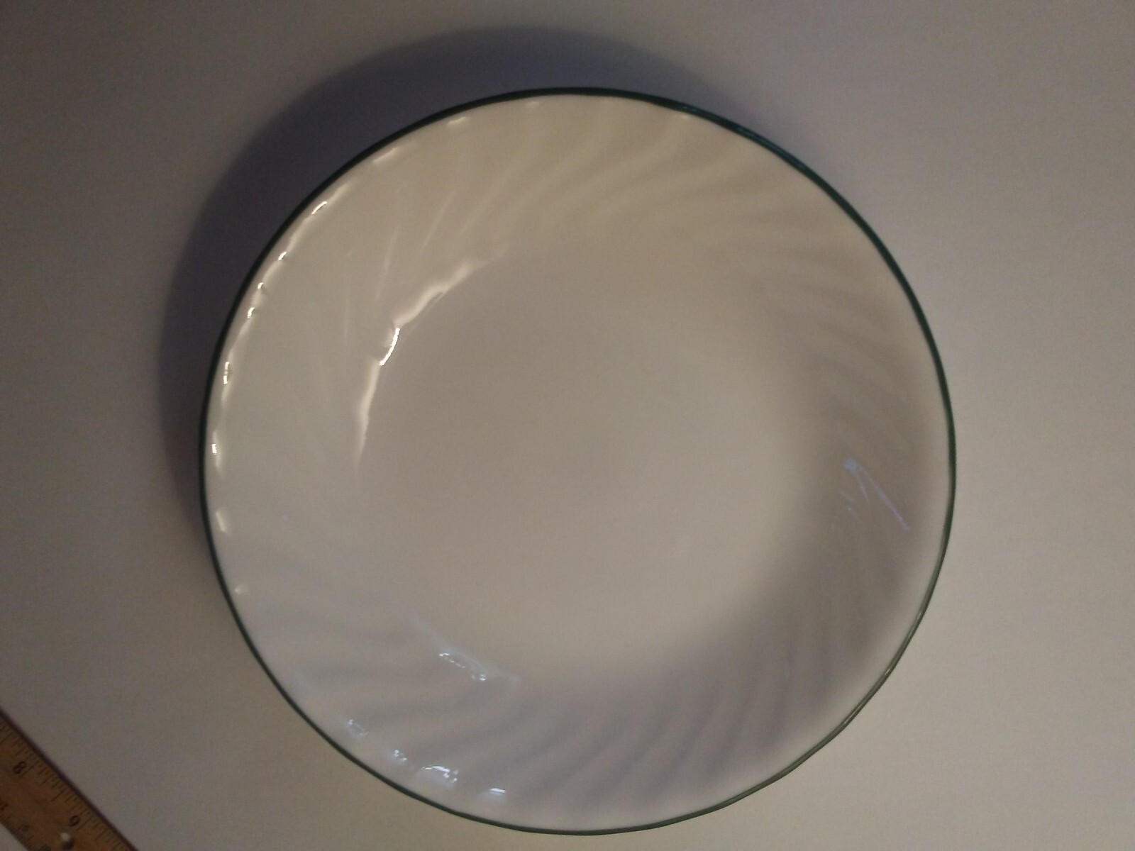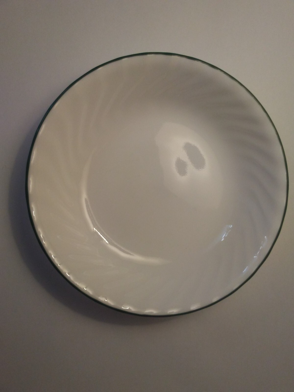 one pasta dish by Corelle in the Callaway Ivy pattern. it has white swirl with one green stripe around rim, see pics. mint. measures 8 1/2 x 1 1/2 inches.