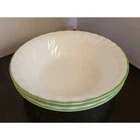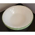 Elevate your dining experience with the Corelle Impressions Chutney set, featuring a round bowl design that is as versatile as it is stylish. Each 7 1/4" diameter bowl is crafted from a durable blend of glass and virtrelle, making them ideal for both everyday use and special occasions. The set includes five cereal/soup bowls, all adorned with the vibrant Chutney pattern that adds a touch of color to any table setting. These bowls are a testament to modern manufacturing techniques, boasting a glossy finish achieved through fused glass production. They are designed to be break-resistant and are both dishwasher and microwave safe, ensuring easy maintenance and convenience. The bowls are white with the green rim (no swirl). Good pre-owned condition. No chips or cracks. The edges are slightly rough to the touch.