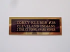 THIS AUCTION IS FOR THE NAMEPLATE ONLY !!!!!!! BOBBY'S HANG-UPS PREMIUM QUALITY ACRYLIC DISPLAY CASES AND CUSTOM ENGRAVED NAMEPLATES SINCE 1999 THESE NAMEPLATES ARE GREAT FOR DISPLAY CASES, FRAMED AND MATTED PHOTOS AND JERSEYS, SHADOW BOXES, PLAQUES, ETC. WE SPECIALIZE IN CUSTOM ORDERS OF ALL NAMEPLATES. WHETHER IT'S FOOTBALL, BASEBALL, BASKETBALL, HOCKEY, GOLF, BOXING OR ANY PERSONALIZED NAMEPLATE THAT YOU MAY NEED. WE CAN MAKE JUST ABOUT ANY NAMEPLATE THAT YOU ARE LOOKING FOR. PLEASE LIMIT THE AMOUNT OF TEXT TO 3 LINES ON THIS SIZE NAMEPLATE. OUR NAMEPLATES ARE TRIPLE ENGRAVED TO GUARANTEE CRISP, READABLE TEXT. NAMEPLATES ARE HAND POLISHED BEFORE SHIPPED TO MAKE SURE THE ENGRAVING REALLY STANDS OUT. ALL NAMEPLATES HAVE HIGH QUALITY DOUBLE SIDED TAPE TO ENSURE IT WILL STAY IN PLACE. CLICK HERE AND GO VISIT OUR EBAY STORE FOR MORE GREAT ACRYLIC DISPLAY CASES AND ENGRAVED NAMEPLATES !!!! PLEASE CHECK OUT OUR EBAY STORE, AND CHECK OUT ALL OF OUR ACRYLIC DISPLAY CASES AND NAMEPLATES. IF YOU DON'T SEE THE NAMEPLATE YOU ARE LOOKING FOR OR IF YOU ARE LOOKING TO PLACE A CUSTOM ORDER, PLEASE FEEL FREE TO EMAIL US AND WE WILL GET WORKING ON YOUR ORDER RIGHT AWAY. THANK YOU! THIS PURCHASE IS FOR A COREY KLUBER NAMEPLATE. IT IS BLACK ON BRASS BACKED ON POLISHED GOLD PLATING. THE NAMEPLATE MEASURES APPROX 1"x 3" IN TOTAL WITH ENGRAVED TEXT THAT READS: COREY KLUBER #28 CLEVELAND INDIANS 2 TIME CY YOUNG AWARD WINNER IF YOU ARE PURCHASING DIFFERENT TEAM OR PLAYER NAMEPLATES, AND DIFFERENT SIZES AT THE SAME TIME, PLEASE USE THE SHOPPING CART FEATURE, AND PLEASE REQUEST A TOTAL BEFORE MAKING PAYMENT TO ENSURE YOU GET THE PROPER COMBINED SHIPPING DISCOUNT. Be sure to add me to your favorites list ! DON'T FORGE T TO LIKE, FOLLOW AND SHARE US ON FACEBOOK TO GET NEWS ON ALL OF OUR NEW RELEASES https://www.facebook.com/bobbyshangups