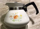 This vintage Corning Ware kettle with a charming Wild Flower Pattern is a perfect addition to your kitchen decor. Made of durable glass, this 6 cup kettle comes with a metal lid that fits snugly to keep your beverages hot for longer. Ideal for serving hot drinks like tea, coffee or hot chocolate, this decorative piece can also be used as a centerpiece on your dining table or as a unique decorative item in your living room. Its elegant design and high-quality construction will make it a cherished item in your collection. Vintage tea kettle teapot Corning ware brand 6 cup capacity P-104 Wildflower design