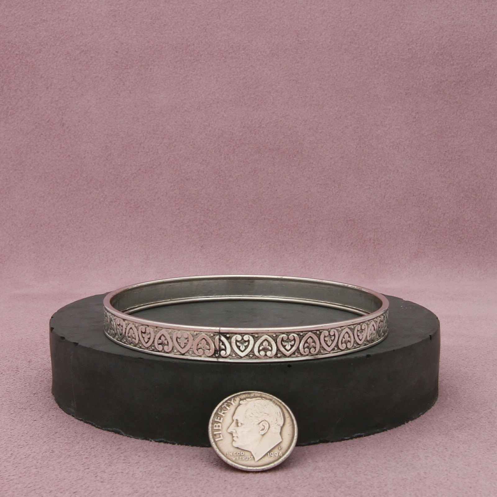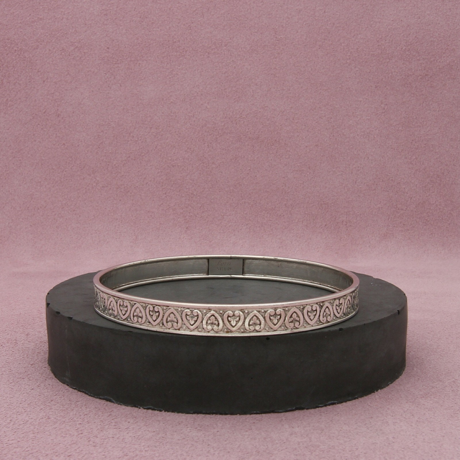 Absolutely love this dainty vintage bangle! The heart scroll detail is so charming, and the sterling silver still shines beautifully. Perfect for stacking or wearing alone—fits comfortably and feels lightweight. Great find for anyone who loves delicate, timeless jewelry!