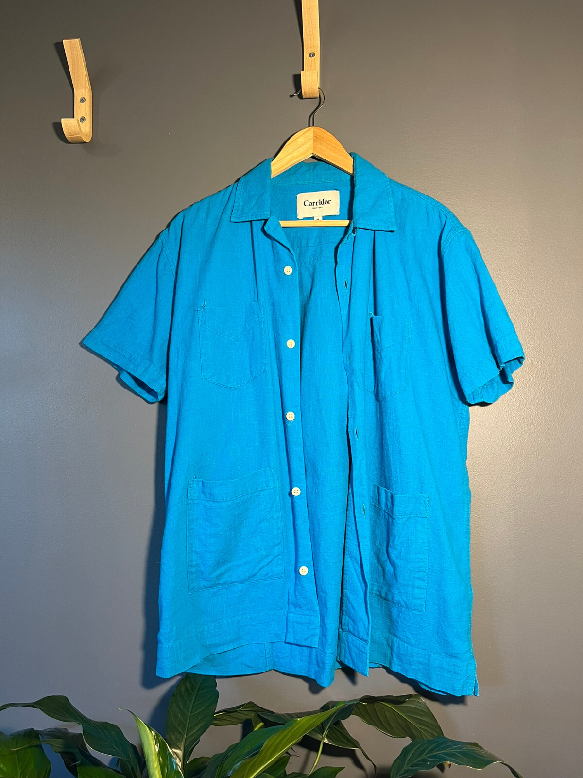 Original Price: $165 This is a Corridor NY men's shirt in size M, featuring a retro design in a teal blue color. The shirt is a button-up style with four pockets, adding a practical element to its vintage-inspired aesthetic. The slub indigo fabric gives it a textured appearance, perfect for adding a unique touch to a casual outfit.