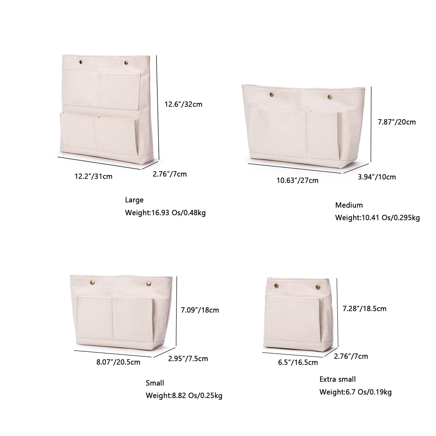 Introducing the Handbag Organizers - the ultimate solution for keeping your handbag organized and stylish! Made from high-quality cotton canvas, our handbag organizers are designed to provide soft protection for your belongings while keeping everything neat and tidy. With multiple pockets and compartments, you can easily organize your essentials such as wallets, keys, cosmetics, and more. The Handbag Organizers are available in three sizes to fit different handbag sizes. The small size measures 10.63” x 4.53” x 5.91”, weighing 9.17 Oz (0.26kg), the medium size measures 11.81” x 5.91” x 7.48”, weighing 13.4 Oz (0.38kg), and the large size measures 14.76” x 7.28” x 7.87”, weighing 17.64 Oz (0.5kg). Our handbag organizers are perfect for those who frequently change bags. Simply transfer the organizer from one bag to another, and you'll have all your essentials within reach. No more digging through a messy bag searching for your belongings! Not only does the Handbag Organizer offer great organization, but it also provides better protection for your valuable items. The soft and durable cotton canvas material ensures that your belongings stay safe and secure. Whether you're using a tote bag, handbag, or shoulder bag, our handbag organizer insert is the perfect accessory to keep your essentials in order. The versatile design allows you to maximize space and efficiently utilize your bag's capacity. Increase your bag's functionality and achieve a clutter-free life with the Handbag Organizers. Made from premium cotton canvas with multiple pockets and compartments, our organizers are the must-have accessory for every fashion-forward individual. Choose quality, style, and convenience with the Handbag Organizers. Order your handbag organizer now and experience the joy of an organized bag! 【Easy to access】Stay organized on the go with the Canvas Purse Organizer Insert! This lightweight and portable handbag insert is designed with multiple compartments for easy access and efficient storage of your cosmetics and valuables. 【High-quality materials】Made from durable cotton canvas material, this compact organizer measures 12.2" x 2.76" x 12.6", making it the perfect size for transferring between handbags effortlessly. Keep your essentials secure and in place with the multiple pockets designed for efficient organization. 【Clean and tidy】No more digging around in your bag to find what you need! The Canvas Purse Organizer Insert is the ideal accessory for those who want to keep their handbag neat and tidy. Easily switch between bags without compromising on style or function. 【Lightweight and durable】With a weight of just 16.93 ounces, this canvas purse organizer won't add unnecessary bulk to your handbag. The durable material ensures long-lasting use, making it a reliable choice for everyday use or travel. 【The best option】Add convenience and efficiency to your handbag game with the Canvas Purse Organizer Insert. Say goodbye to clutter and hello to easy access and organization for all your essentials. Upgrade your handbag today!