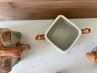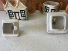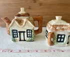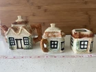 This is a vintage Cottage Ware tea set made in England by Price Kensington in the 1960s. The set includes a teapot, creamer, and sugar bowl, all featuring a brown cottages pattern. The set is an original and made of ceramic. It is a collectible item that would make a great addition to any kitchen or home decor. This set is in excellent condition with no chips or cracks. From smoke free home.