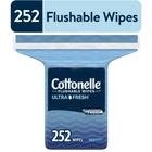 Enjoy a complete clean with the #1 septic-safe wipes brand*, Cottonelle Ultra Fresh Flushable Wet Wipes. These adult wipes wash away odor-causing mess and remove up to 100% of residue, making them great for everyday use. Cottonelle Ultra Fresh Flushable Wipes are designed with 3x cleaning power, designed to remove mess, reduce odor, and protect hands for a clean that feels complete. Each wet wipe is safe for sensitive skin and made with purified water. Our adult wet wipes are 100% flushable, septic-safe, and plumber-approved. Each resealable bag has 252 flushable wet wipes per pack with pull-apart sheets for easy 1 resealable bag of Cottonelle Ultra Fresh Flushable Wet Wipes, 252 flushable wipes per pack; Cottonelle flushable wipes packaging and product may vary A Complete Clean: Cottonelle Ultra Fresh Flushable Wipes remove up to 100% of odor-causing residue 3x Cleaning Power: Our flushable wipes for adults remove mess, reduce odor, and protect hands Safe For Sensitive Skin: Cottonelle disposable wipes are hypoallergenic, and made with purified water Cottonelle wipes are FSC certified, supporting responsible forestry and only uses fibers that are 100% plant-based Order Cottonelle wet wipes online with delivery to your door or pickup in store