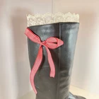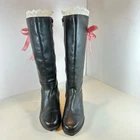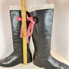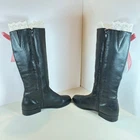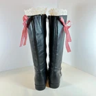 Coup D'etat Black Tall Leather Boots Fighter Riding Women's 7.5 Lace Edge Ribbon Detail ALTERED OOAK Lovely boots in excellent condition. There are red and white bows in ribbon blued to the sides and lace blued around the edge, I think this was done after market, but it's well done and looks as if the boots came this way! They are one of a kind! Original style is called "Fighter". Leather upper Size 7.5 No flaws or signs of wear, might be unworn.