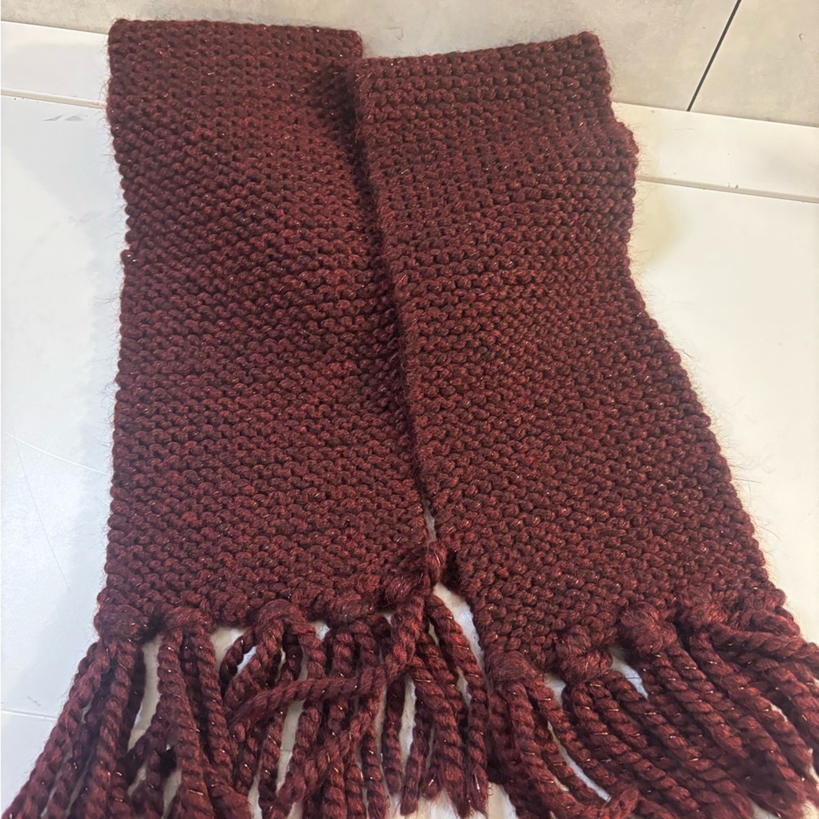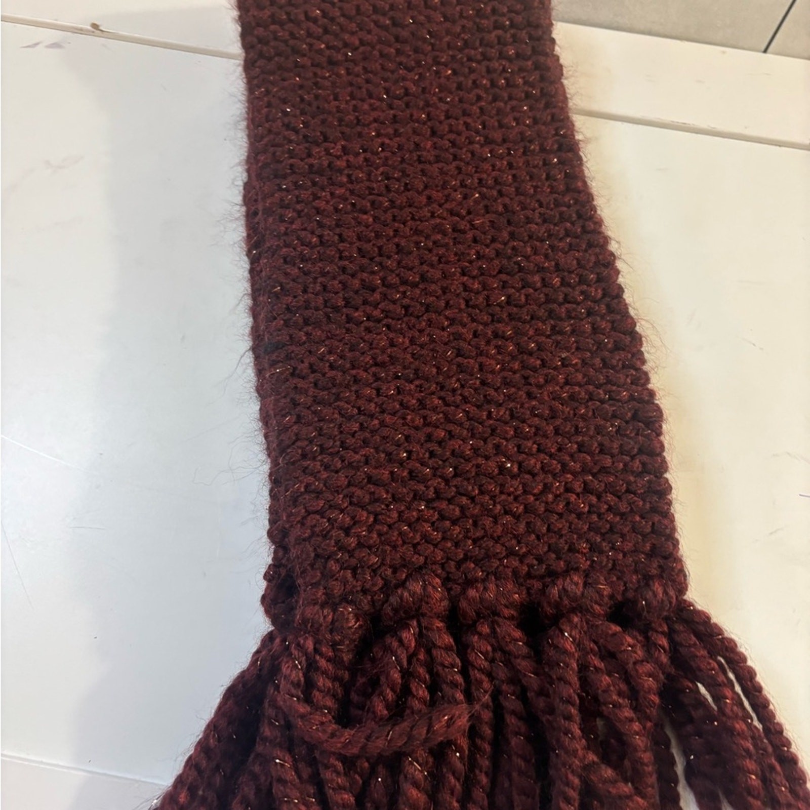 Warm and stylish burgundy knit scarf with fringe detailing. Perfect for chilly days. It is item a chunky, burgundy hand-knitted scarf with fringe, likely made from a wool or acrylic blend yarn with a subtle sparkle. The knit appears to be in a garter stitch pattern (knitting every row), which is known for its durable, textured, and soft feel. Key Features Color: The deep hue is a rich burgundy, oxblood, or wine red, which can have various names depending on the specific yarn used. Material & Texture: It is a soft, chunky knit, potentially an acrylic or wool blend, and features metallic or glitter fibers that provide the sparkly appearance. Design: The scarf has a simple, classic rectangular shape with fringe at both ends, giving it a cozy and traditional look. Measures 5.5”x 28”