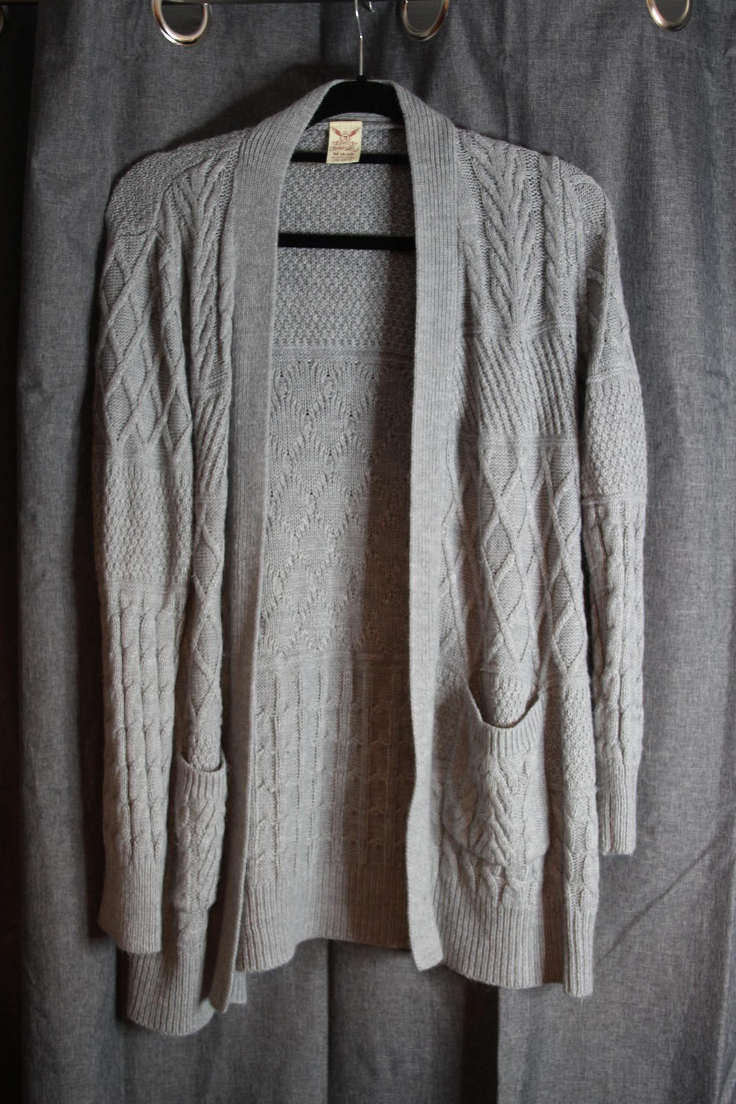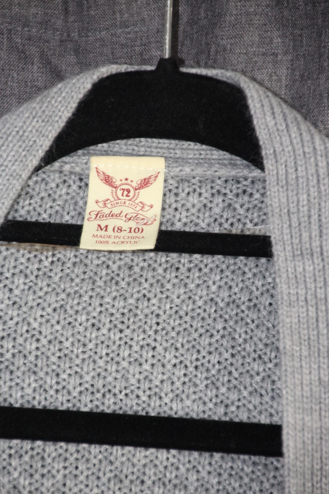 Stay warm and stylish with this lovely grey cable knit cardigan sweater from Faded Glory. Features soft knit fabric with a charming mix of cable patterns. Open front design with two handy front pockets. Perfect for layering in cooler weather or casual outings. Size Medium (8-10) - fits comfortably and looks great! Machine washable and easy to care for. A versatile addition to your wardrobe that pairs well with jeans or leggings.