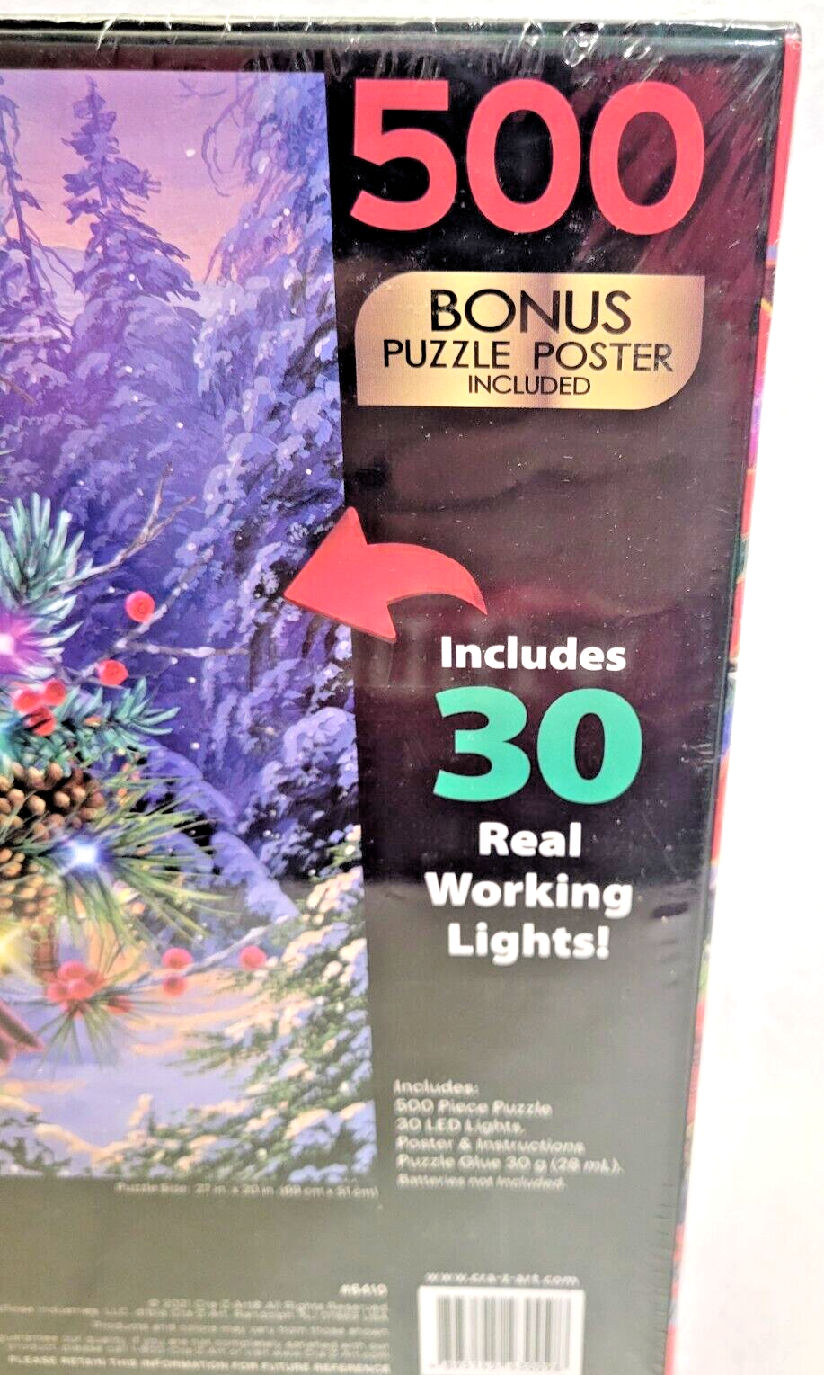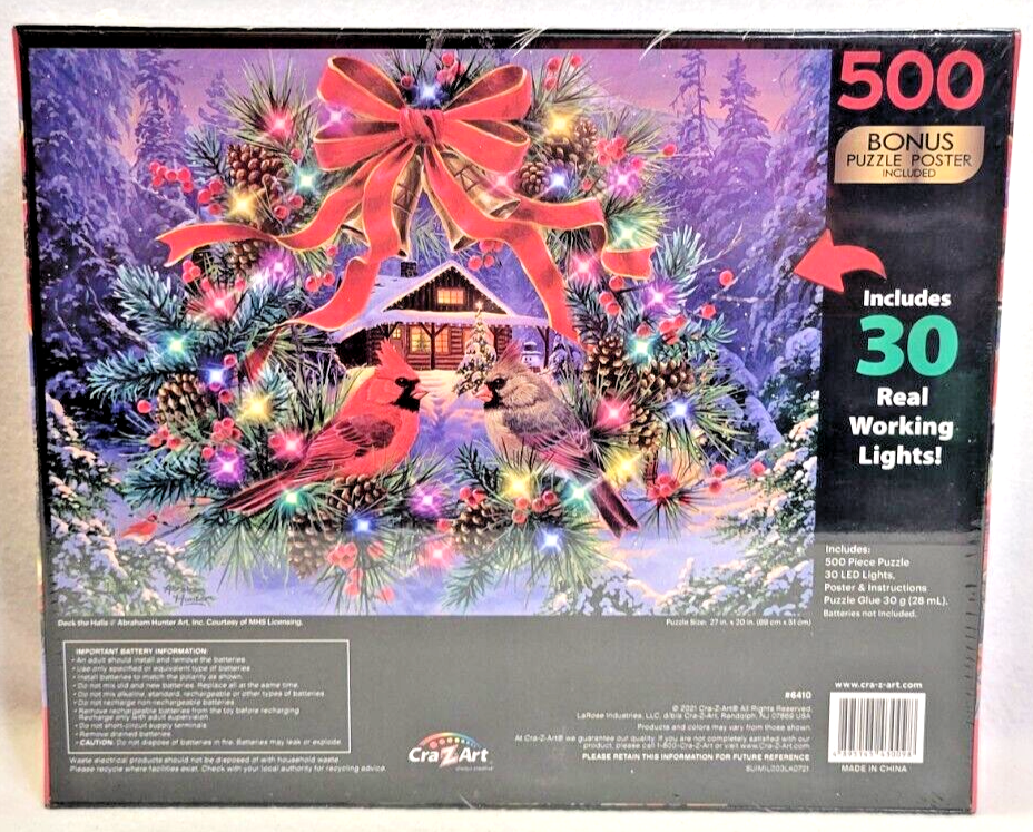 Enjoy the holiday season with this Cra-z-art jigsaw puzzle featuring "Deck The Halls" artwork of Abraham Hunter. With 500 interlocking pieces, this puzzle offers a fun and challenging activity for the whole family. Add to it the 30 working lights (requiring 2 AA batteries, not provided), and you have a wonderful addition to your holiday season spirit. Made of durable cardboard material, it ensures long-lasting use and complete satisfaction. This puzzle is perfect for anyone who loves art and Christmas. With multi-color and lighted features, it adds a festive touch to any room. It comes from a smoke-free household. Add this to your collection of contemporary puzzles and have a merry time! Doing puzzles has some hidden benefits . Excellent qualities : Cultivate concentration, patience, and temper your will Movement development : Train hand-eye coordination and precise small movements Spatial intelligence : Improve visual discrimination of colors and shapes Critical thinking ability : Understand the relationship between parts and the whole, and draw inferences from one example to explore the future Relaxes your mind : Relieve work pressure and release yourself Brain development : Enhance memory and may help prevent or slow brain degeneration Each item we ship is carefully packaged to prevent any damage and is shipped immediately with tracking. The box has minor wear. Please see the pictures for details. Puzzle pieces are crisp and clean.