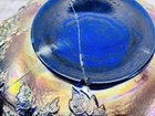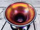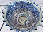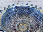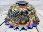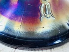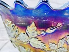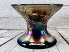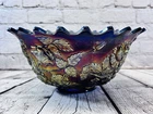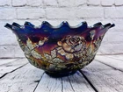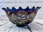 Vintage Fenton Cobalt Blue Carnival Glass Wreath of Roses Persian Medallion AS IS This vintage Fenton punch bowl and base feature the Wreath of Roses exterior with Persian Medallion interior in cobalt blue carnival glass. Displays beautifully despite visible damage. •Pattern: Wreath of Roses with Persian Medallion interior •Color: Cobalt Blue Carnival Glass •Bowl Size: 5.5”H x 12”Dia •Base Size: 5”H •Total Height: 9.75” •Condition: Crack from base up side, chip on rim, base cracked, scratches to finish •Note: Sold as is for display or repair Rare cobalt Persian Medallion example with deep iridescent tones. Ships securely with care.