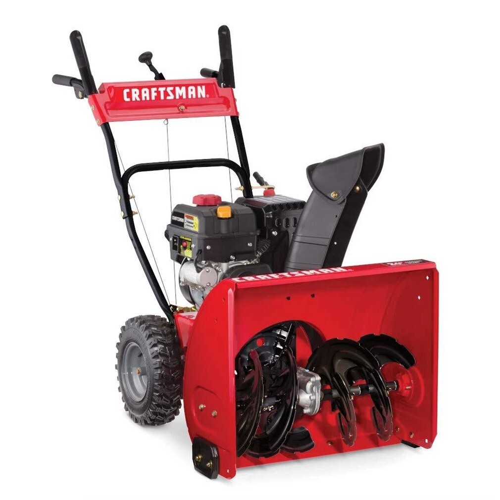 Tackle winter weather with the Craftsman 24" Electric Start Two-Stage Snow Blower. Tired of the hassle of manual starters? This snow blower features a robust 208cc engine that quickly springs to life at the push of a button, making your snow-clearing experience smooth and efficient. Its medium-duty rating ensures it can handle most snowfall, while the 24-inch clearing width leaves ample space for driveways and walkways. The Craftsman SB410 is designed with a modern style, sporting a vibrant red color that stands out in any snow-filled landscape. With a durable metal construction, it's built to last through the coldest of seasons. The two-stage system provides exceptional performance, and the 5-gallon tank capacity means you'll spend less time refueling and more time getting your property clear. Note that some assembly is required, and the user manual is included to guide you through the process.