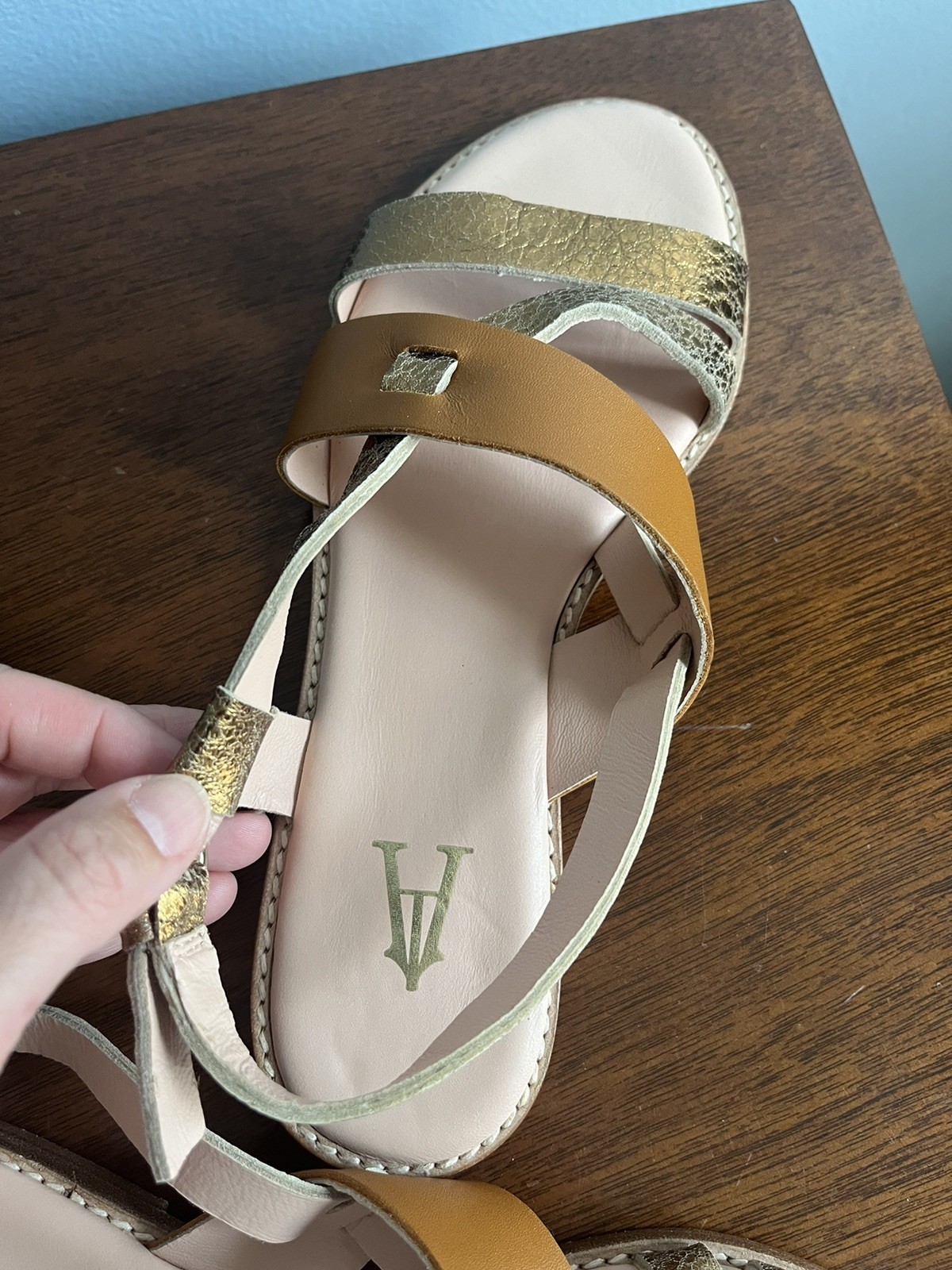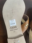 The Craie Studio gold metallic French Lambskin Leather sandals in size 8.5 are stylish and versatile for various occasions such as travel, parties, or casual wear. These slingback sandals feature a flat heel, arch support, adjustable strap with a buckle closure, and breathable lining made of lambskin for comfort. The gold color and metal theme add a touch of glamour, perfect for summer and spring seasons. The artisan buckle detail and pebbles character give these sandals a unique and fashionable look, making them a standout choice for any woman's shoe collection.