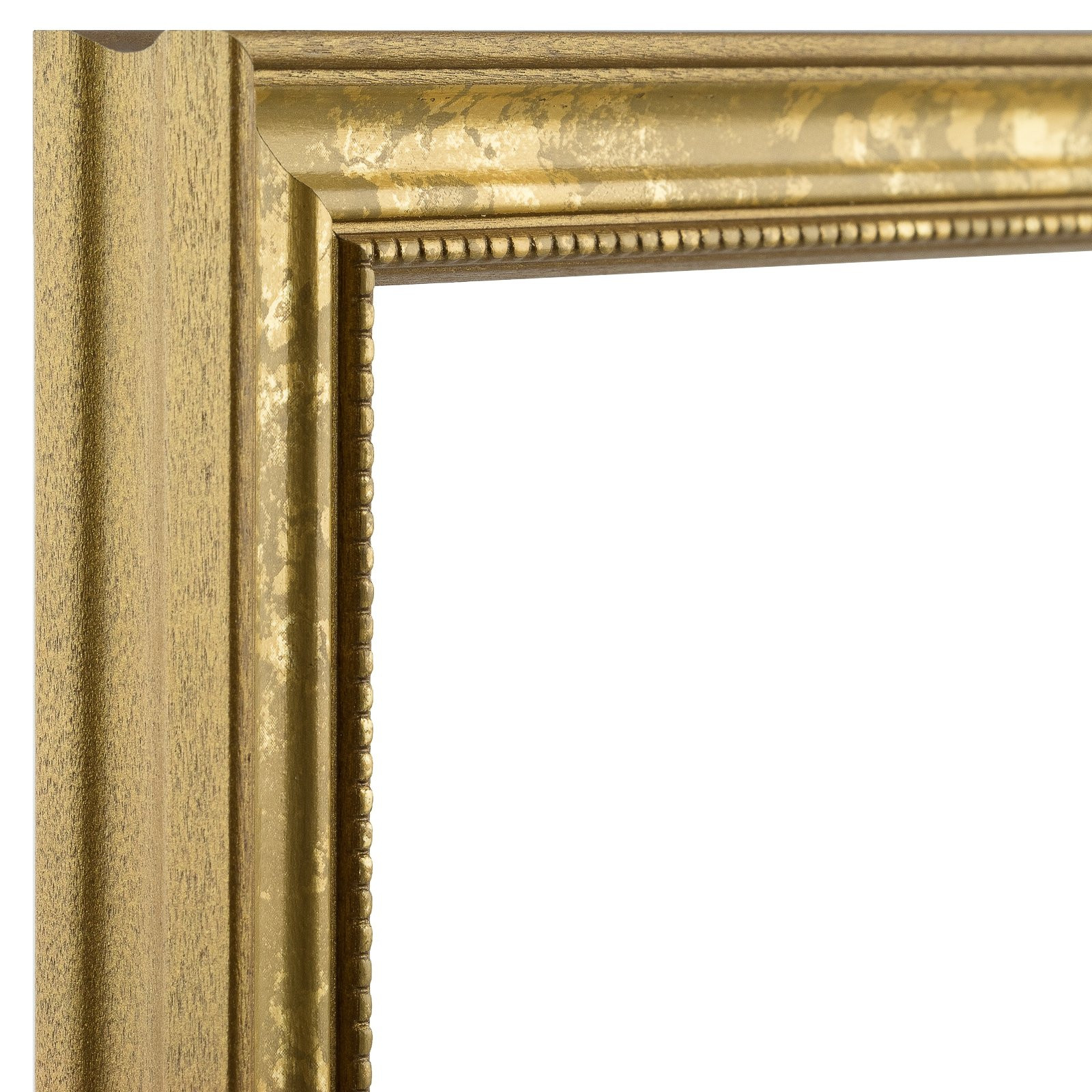 Ornate style, decorative gold facing, darker gold sidewall with beading and wood finish Frame includes: clear styrene facing, rigid cardboard backing and wire hanging hardware kit (some assembly required) Fits a 12x18 Photo/Print/Poster (Viewable area is slightly smaller) Frame molding is 0.75 Inch wide, Real poplar, Solid wood Frame measures 12 Inch by 18 Inch