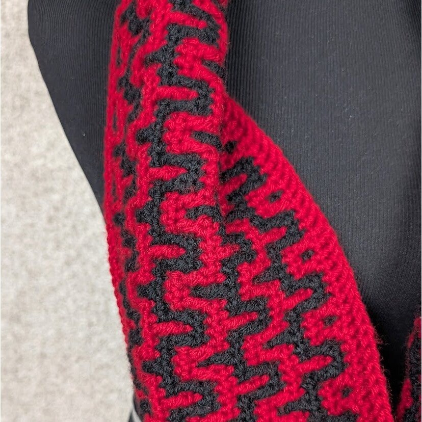 Mosaic Infinity Scarf - Cranberry/Black You will love the intricate pattern of this scarf. Soft and luxurious, this scarf will look beautiful with any coat and keep you warm. It is long enough to be doubled for a thick protection from winter's chill. The scarf measures 50" around and 7" wide. Machine washable and dryer safe. Hand Crocheted in a smoke free/cat friendly home Keywords: cowl scarf, infinity scarf, knit scarf, neck warmer, red and black scarf, winter scarf, loop scarf, geometric scarf, womens scarf, scarf, winter accessory, knit cowl, fashion scarf