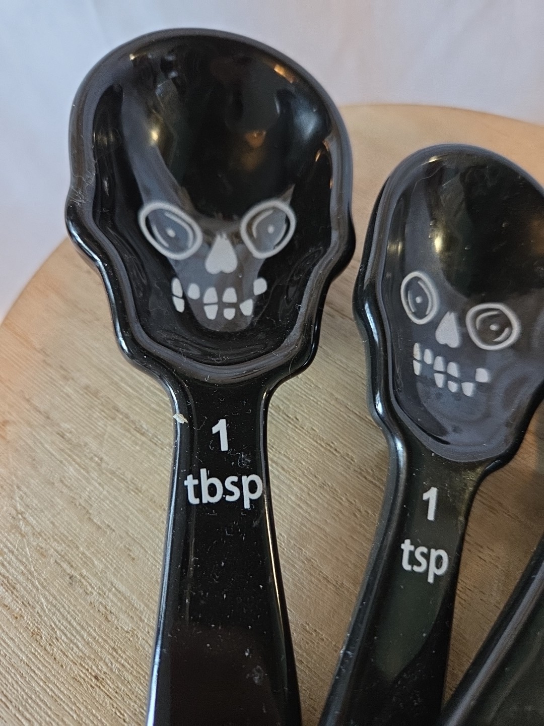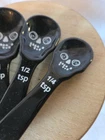 Add some spooky touch to your kitchen with this Crate & Barrel X Patch NYC Skull Measuring Spoon Set. The set includes four ceramic spoons with nesting feature, measuring markings, and easy clean design. The black color and skeleton character family make it perfect for Halloween occasion or everyday use. Crafted in China, this measuring spoon set is a great addition to any kitchen. Whether you're measuring out ingredients for a delicious meal or simply adding some decor to your space, these spoons are sure to impress.