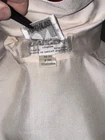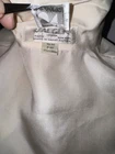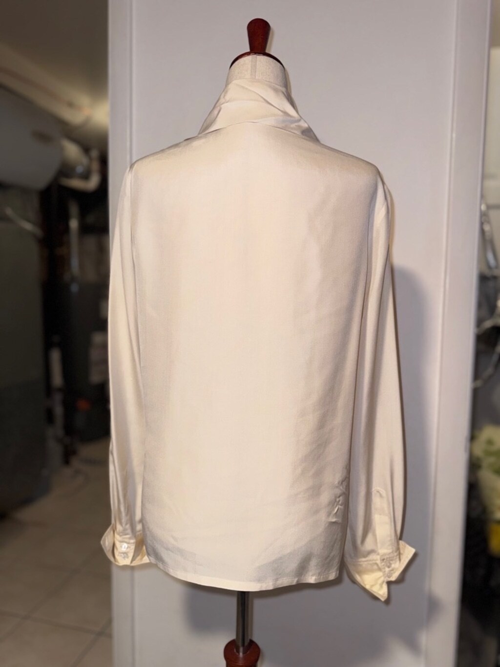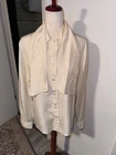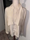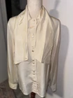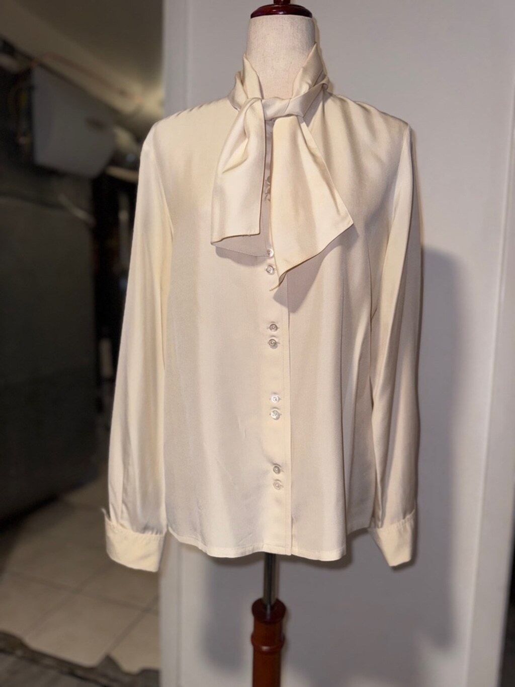 This is a long sleeve blouse cream colored, it is 100% silk. Made by. Neusteters, the second text says Yeager London Paris, New York. Made in Great Britain. To fit bust 38 inches. 100% silk. The shirt is very unique. First of all is flawless. It looks like brand new. It has double buttons all the way down the front. Double buttons on the cuffs. You can button the cuffs and then still have the cuff turned over. It has a collar all the way around and it comes down to a tie in the front.  from under arm to under arm is 21 inches. From the top shoulder seem to the bottom hem of the shirt is 25 inches.