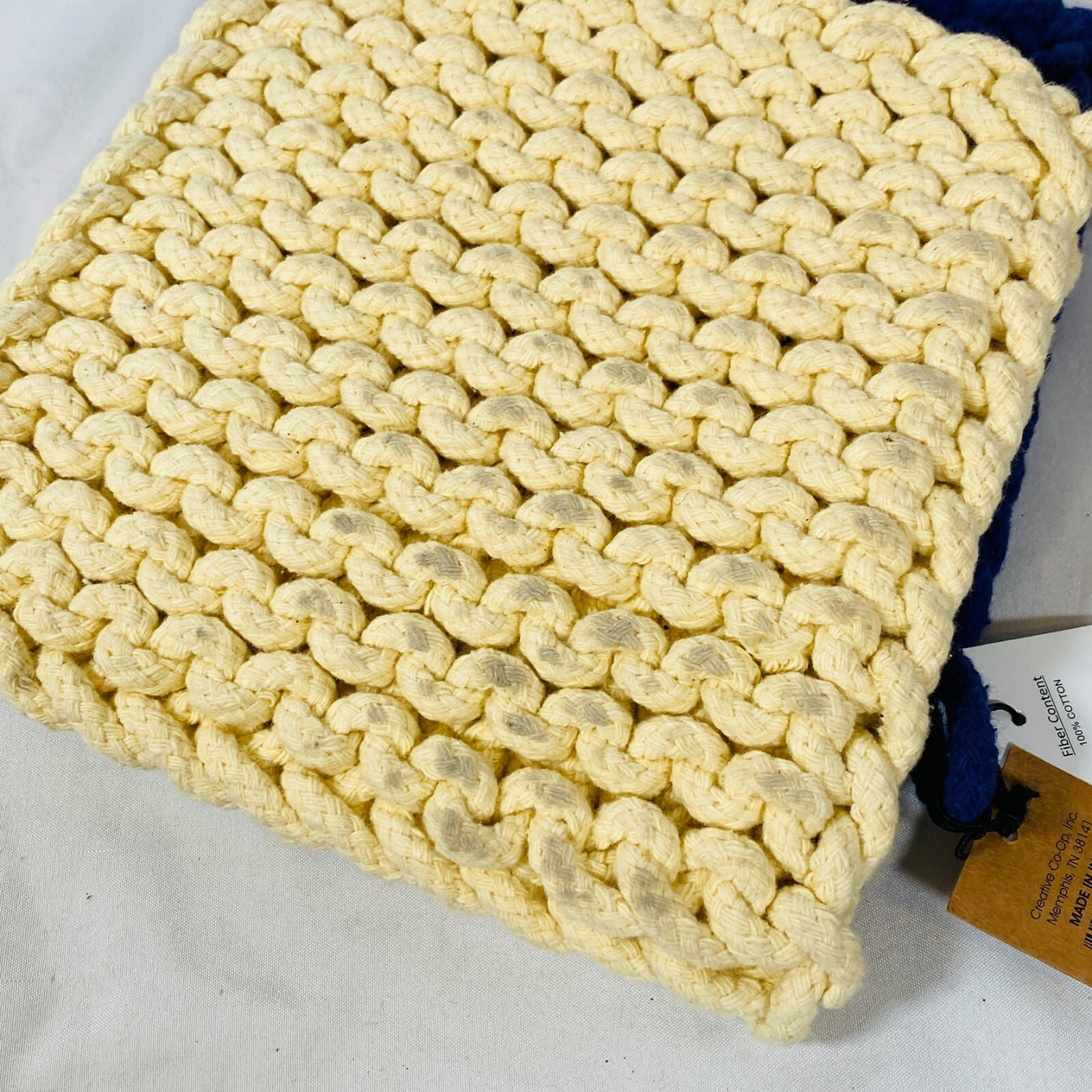 Set of 2 Creative Co-Op 8" Square Cotton Thick Crocheted Pot Holders. Includes 1 Cream/Beige + 1 Navy Blue Trivet-Style Potholders, made out of 100% Cotton. New with tags, but they were stored together so the cream one has what appears to be blue dye transfer from the other one. As they still have the tags attached, I haven't attempted to clean them, so it may wash out easily, not sure, sold as is. Either way, they are lovely thick potholders that will serve you well! Please see all pictures for exact cosmetic condition and other details, as they are part of the description as well, and ask any questions before purchasing. We are a husband and wife team with a growing family, and greatly appreciate your support of our small business. Please browse our eBay store for a variety of other kitchen equipment. We hope you enjoy this set!