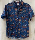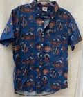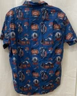 This men's button-up shirt by Creepy Co features an all-over print design inspired by the horror movie "Friday the 13th," specifically featuring imagery of Jason Voorhees. The shirt is in size large, with short sleeves and a button-down collar style. The blue woven fabric gives it a casual look suitable for summer wear. The graphic print adds a bold touch to the design, perfect for fans of horror and the iconic movie franchise.