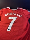 Show your support for Manchester United and one of their greatest players of all time, Cristiano Ronaldo, with this officially licensed Adidas jersey. The red jersey features the iconic number 7 and is perfect for any fan or collector. The size is a men's L and it is made for soccer enthusiasts who love to wear their team's colors with pride. This jersey is a must-have for any fan of Ronaldo or Manchester United, and it is sure to be a conversation starter whenever you wear it. Flaws shown in photos