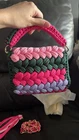 This is a small shoulder bag with a woven pattern and crochet accents. It features a latch closure, multicolor exterior and lining made of cotton. The bag has a gold hardware color, detachable strap, and bag charm. It is designed for women and has a unique and stylish appearance with a multicolor handle/strap and exterior.