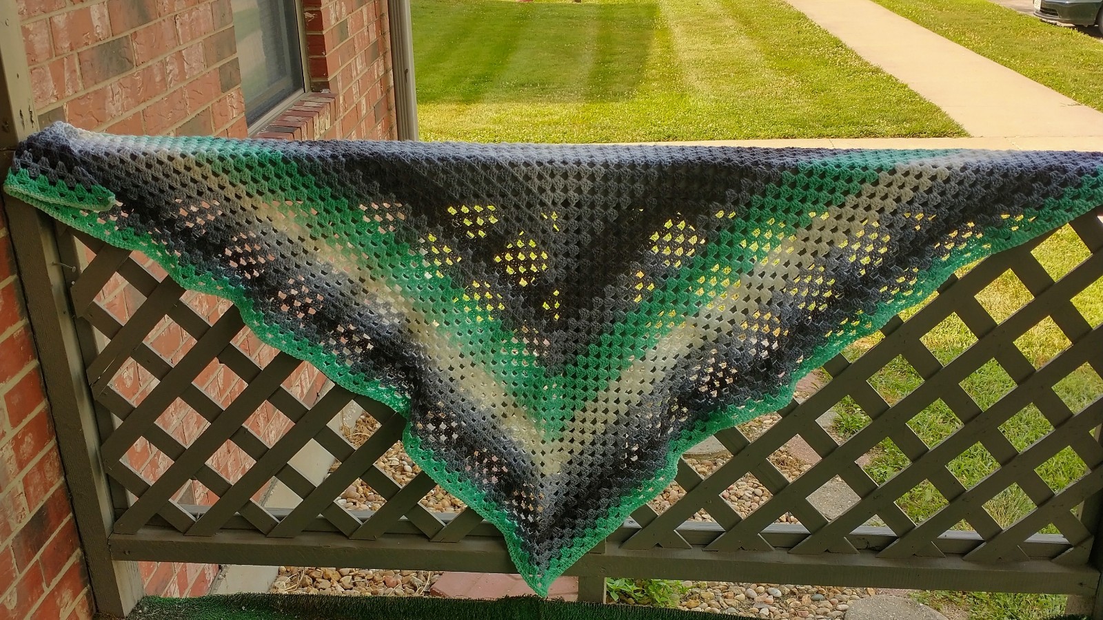 Beautiful monochrome with a touch of green crochet shawl. Made with soft multicolored acrylic yarn. Lightweight, soft, and warm, for cooler days ahead. This definitely will be a unique addition to your wardrobe. It makes for a great gift as well. Measures approximately 93"W x 43" L. Machine washable and dryable. *This is a handmade item and may contain unintentional flaws*