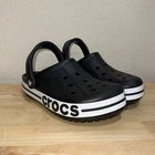 Elevate your casual style with these Crocs Bayaband Clogs, perfect for any occasion from travel to the beach. The slip-on design with ankle strap and closed-toe clogs provide both comfort and style. The waterproof and breathable features make them perfect for those hot summer days. These clogs are made from ethylene vinyl acetate and have a synthetic outsole and insole material. The Crocs Bayaband Clogs come in black and feature a chevron logo accent. They are available in men's size 7 and women's size 9. Get ready for the summer, fall, or spring with these versatile and fashionable clogs.
