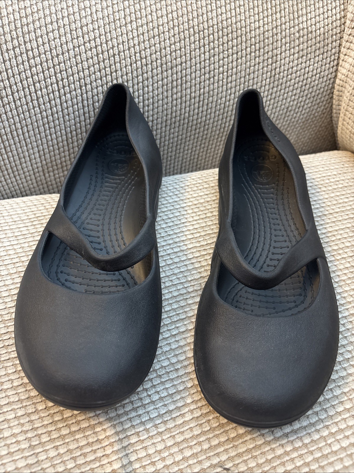 These Crocs Black Ballet Flat Mary Jane Slip On Shoes for women in US size 7 are a stylish and comfortable choice. The slip-on style and straps make them easy to wear, while the ballet design adds a touch of femininity. Crocs Alice model features a sleek black color and the signature Crocs material, ensuring both style and durability. Perfect for everyday wear, these flats are a versatile addition to any woman's shoe collection.