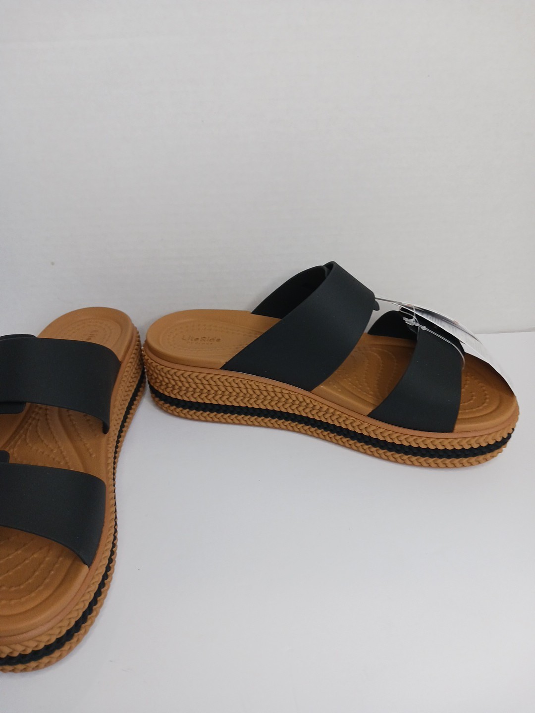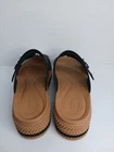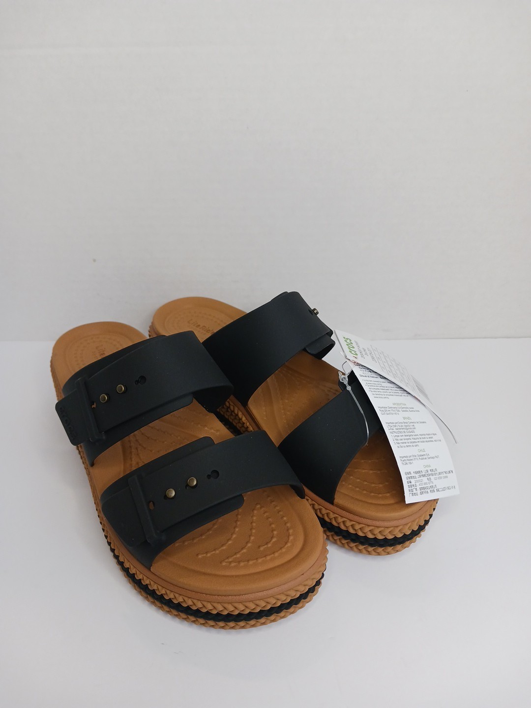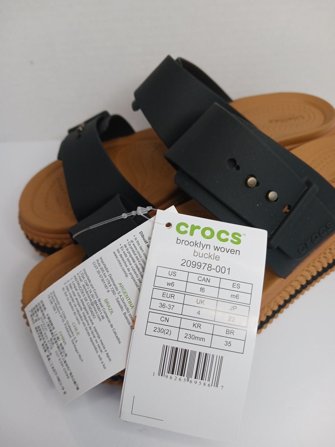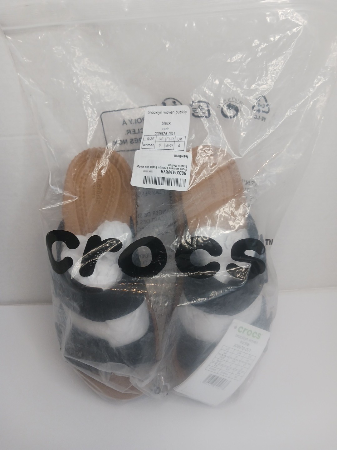 The Crocs Brooklyn Woven Buckle Sandals in black are lightweight and comfortable slip-on style sandals, perfect for casual occasions. These sandals feature a rubber outsole, breathable matlite upper material, and a platform heel style for added support. With a classic outdoor theme and logo accents, these sandals are stylish yet practical for all seasons. Made by Crocs, these sandals are designed for women with a US shoe size of 6, making them a versatile addition to any wardrobe.