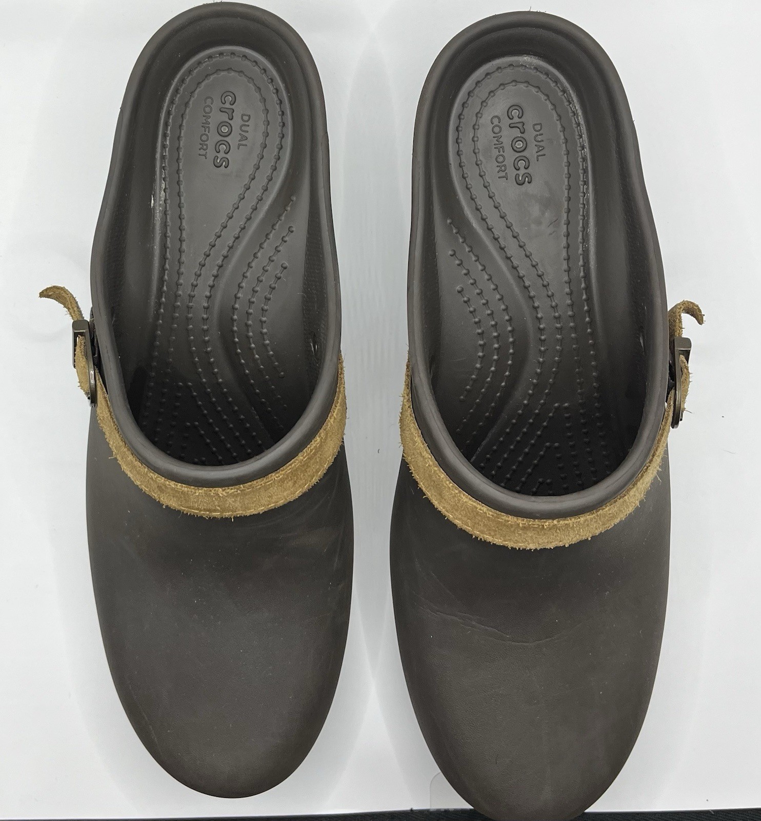 The Crocs Signature Cobbler Clogs in brown are stylish slip-on heels designed for women in size 11. These mid-height block heel shoes are perfect for casual occasions during the summer, fall, and spring seasons. The dual comfort features make them a versatile choice for everyday wear, and the buckle accents add a unique touch to the classic clog style. Made from rubber, these Crocs Cobbler clogs are a comfortable and trendy option for any woman's wardrobe. Excellent condition, except two small scuff marks on last picture Same day shipping Smoke free home