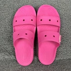 Slide into summer with these Crocs Classic 2-Strap Sandal Slides in Bright Pink. Perfect for travel, activewear, and casual occasions, these slip-on sandals feature a flat heel and a rubber outsole for comfort and durability. The synthetic upper material is waterproof, making them perfect for those unexpected rainy days. With accents of a strap and logo, these sandals have a classic theme that is perfect for any outfit. The Crocs Classic 2-Strap model is designed for women with a US shoe size of 13 and men with a size of 11. Made in Vietnam, these sandals are not handmade and are not customized. Get your hands on these stylish slides today and enjoy the summer, fall, and spring seasons in style.