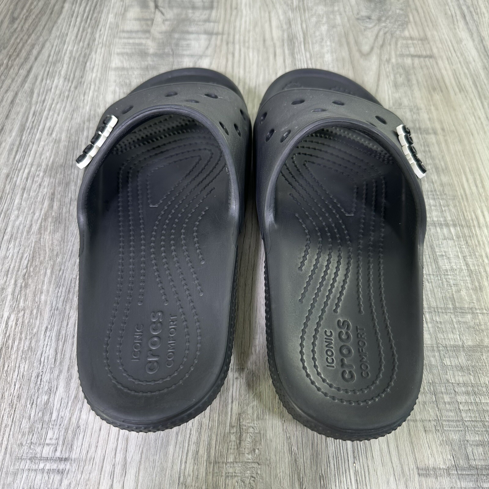 Crocs Classic Black Slides Mens 7 Womens 9 Slip On Sandals Shoes Beach Water. In used condition please see pictures for details. Little wear very nice condition.