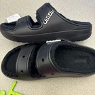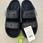 Get ready for your next adventure with these Crocs Classic Cozzzy Slip On Sandals in black. These sandals feature a solid pattern and are lined with faux fur for added comfort. The slip-on closure makes them easy to wear and take off, making them perfect for travel, activewear, and casual occasions. The low heel style and rubber outsole material provide durability and support, while the croslite upper material and synthetic insole material ensure a comfortable fit. These unisex sandals are available in women's shoe size 11 and men's shoe size 9. Don't miss out on this opportunity to add a pair of Crocs Cozzzy Sandals to your shoe collection.