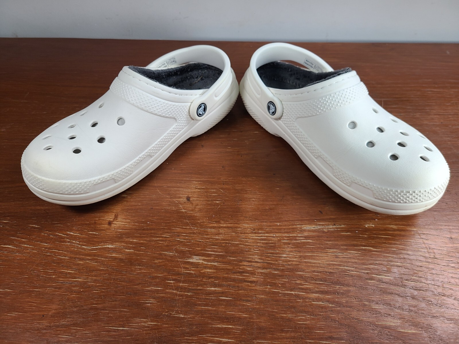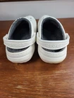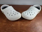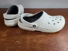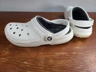 Crocs Classic Lined Clogs Slip On 203591 White Gray Mens Size 7 Women Size 9. Crocs are in preowned condition. See pictures for details. Please ask any questions before purchase. If there is any issue, please contact us first before leaving feedback. Thank you.