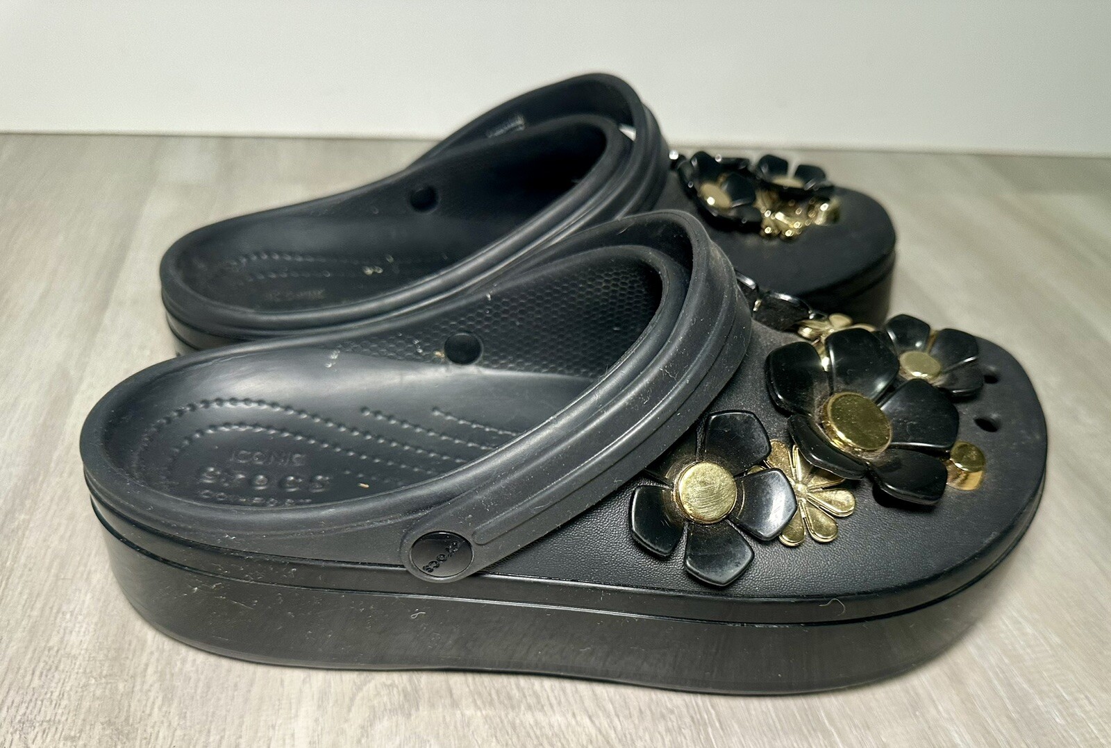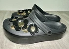 Crocs Classic Platform Clog Black & Gold with Flowers Size 11 Benefits Charity. Condition is Pre-owned. Shipped with Standard Shipping.