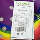 Unleash your vibrant side with the Crocs Classic Rainbow Dye Multicolor Clog, a playful addition to any casual ensemble. These clogs are designed with a tie-dye pattern that boasts an array of hues, making them a stand-out piece. Crafted for comfort and ease, they feature a slip-on design that ensures a secure and comfortable fit for everyday wear. Built to suit a variety of seasons, these synthetic upper clogs provide breathability and are equipped with a cushioned insole to support your arch. They're also lightweight and water-resistant, making them a practical choice for any setting. Whether you're out for a casual stroll or enjoying a day at the beach, these limited-edition Crocs offer both style and function in one vibrant package.