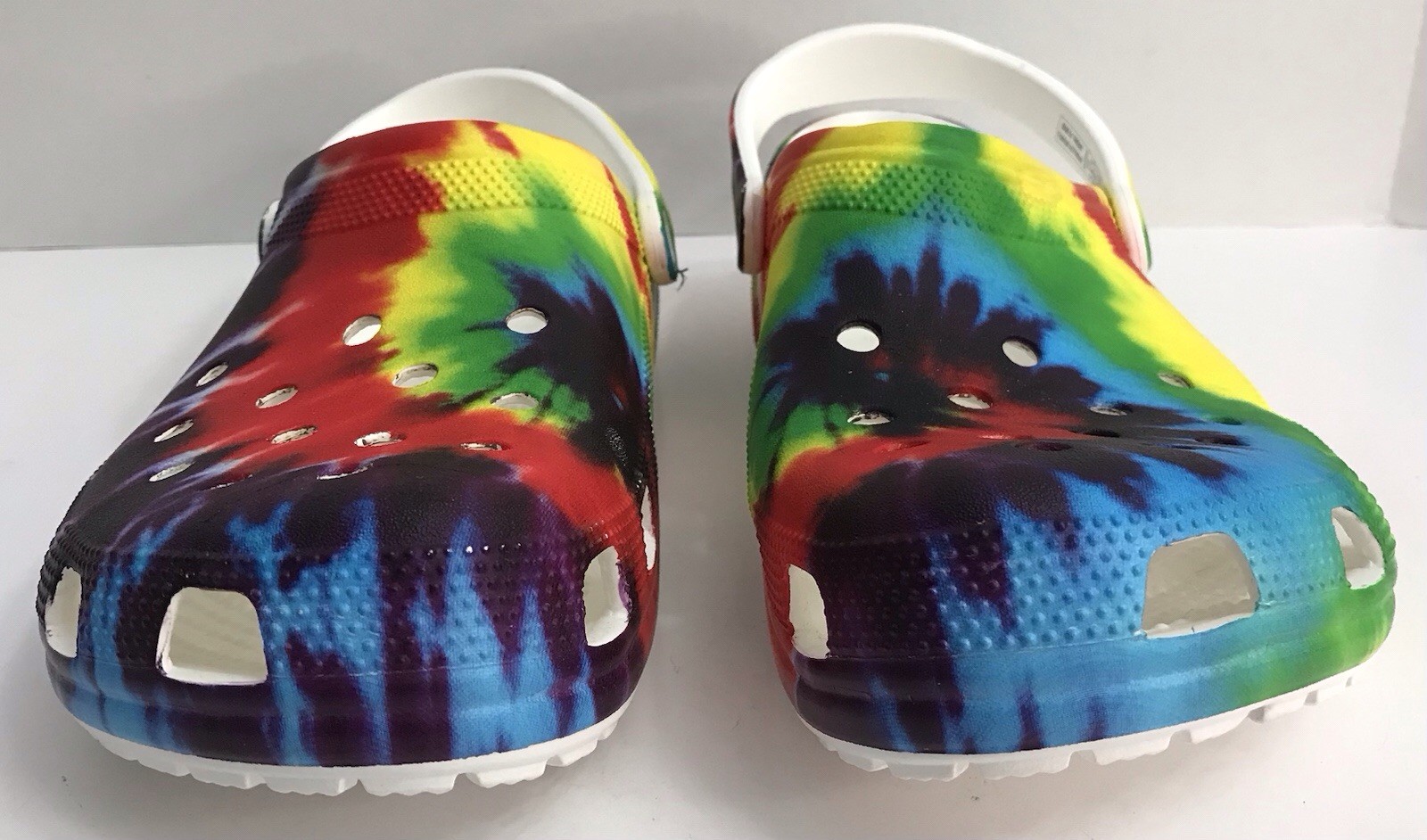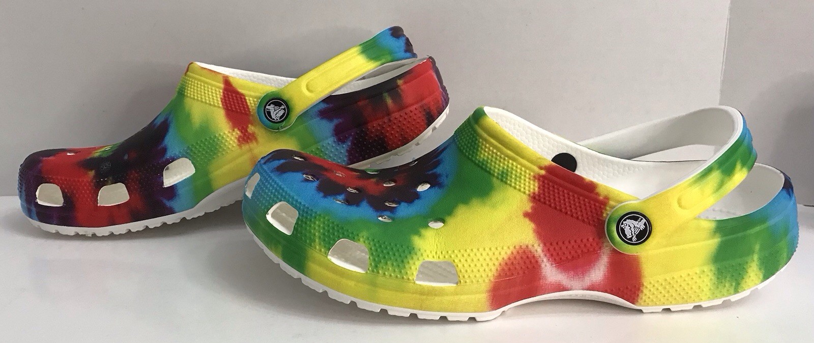 Crocs Classic Tie Dye Graphic Clogs Size M 12 W 14 Primary Colors Rainbow Excellent pre-owned condition. Not sure if they have actually been worn at all. There is a little bit of color missing on the back of the right heel. Please see all pictures for condition details.