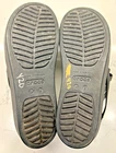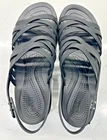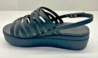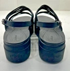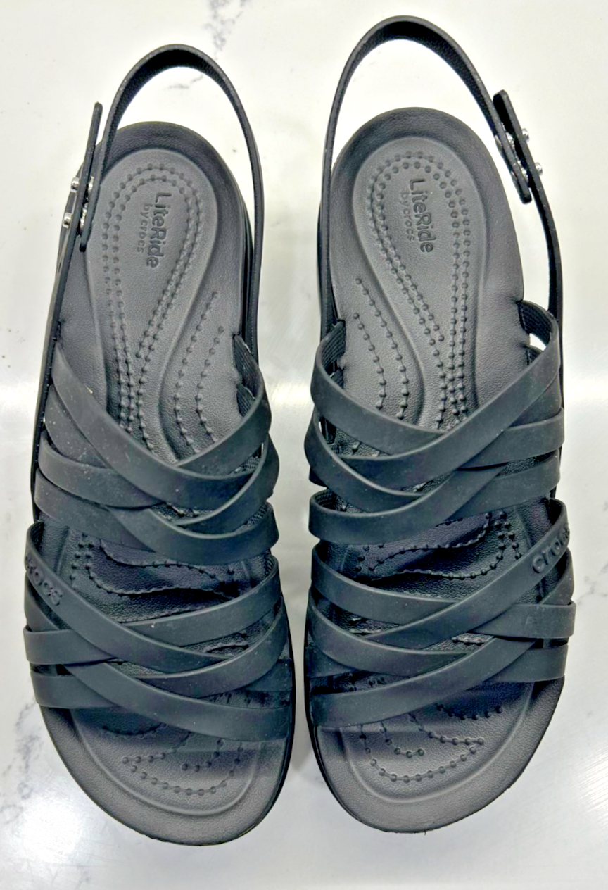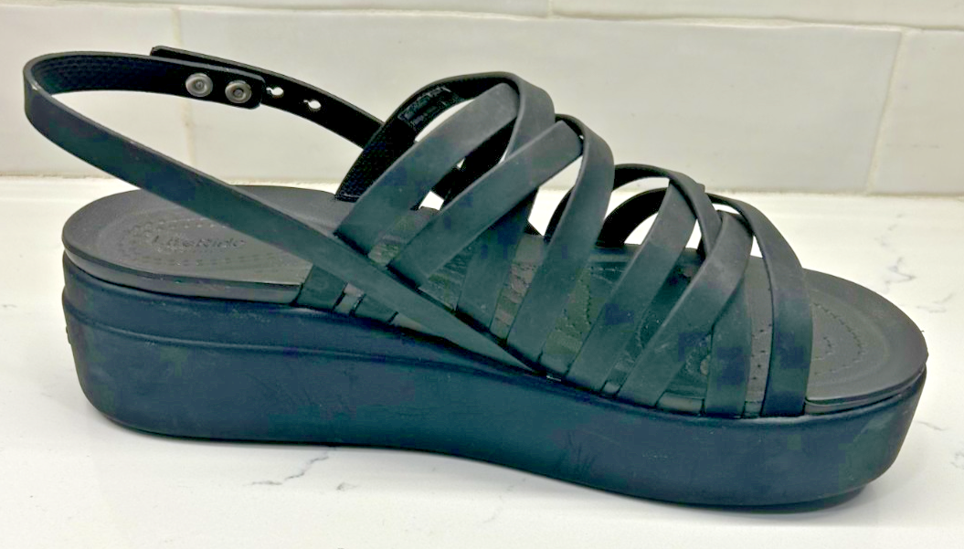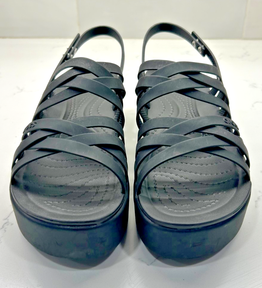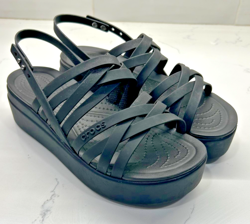 The Crocs Literide Brooklyn strappy Platform Wedge in size 8 is a stylish and comfortable sandal designed for casual occasions during the summer and spring seasons. The black color and logo accents add a touch of personality to the wedge heel style, featuring a rubber outsole for added durability. With a synthetic lining and rubber upper material, this Crocs Brooklyn model offers the signature comfort and support that the brand is known for, making it a great addition to any woman's shoe collection.