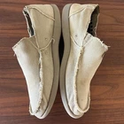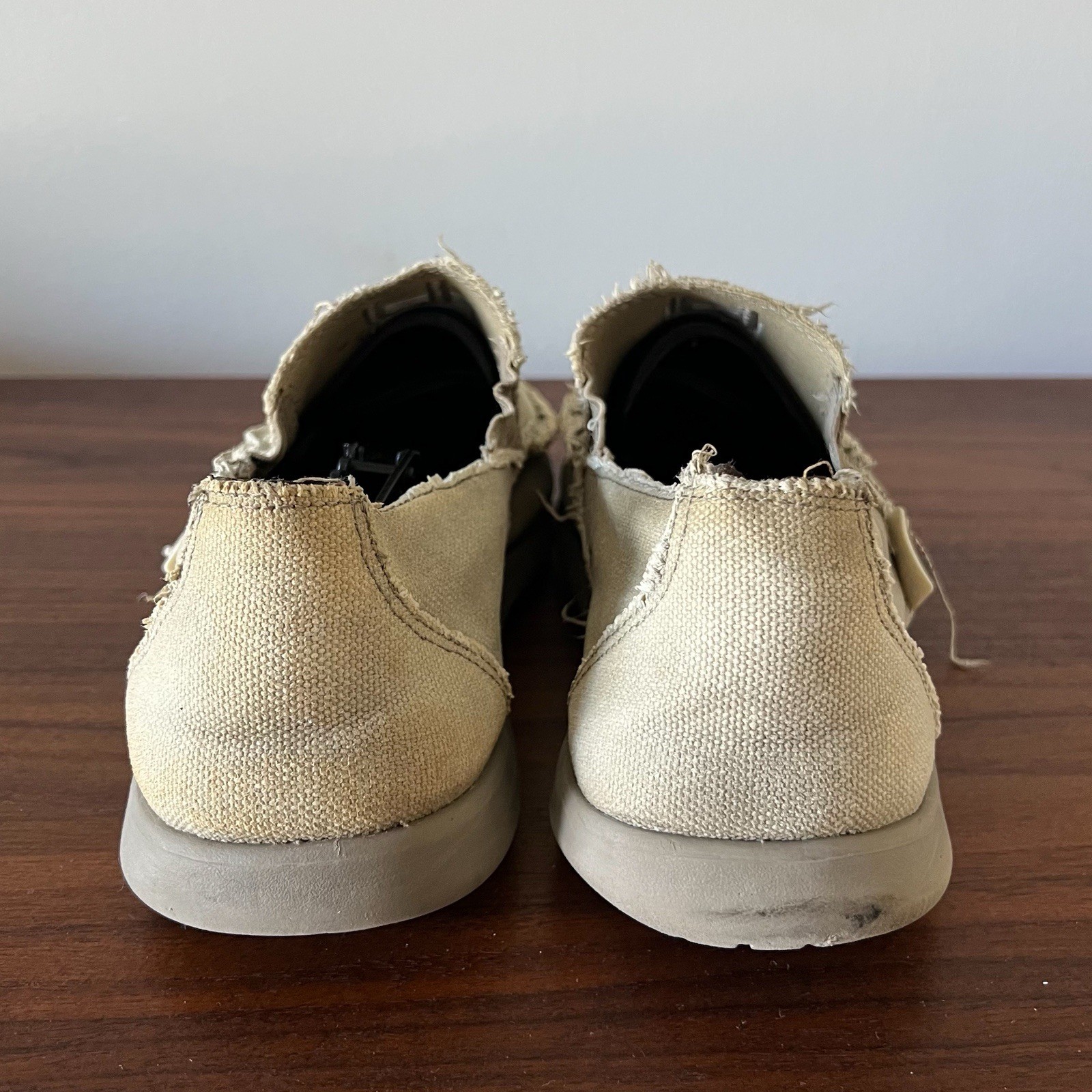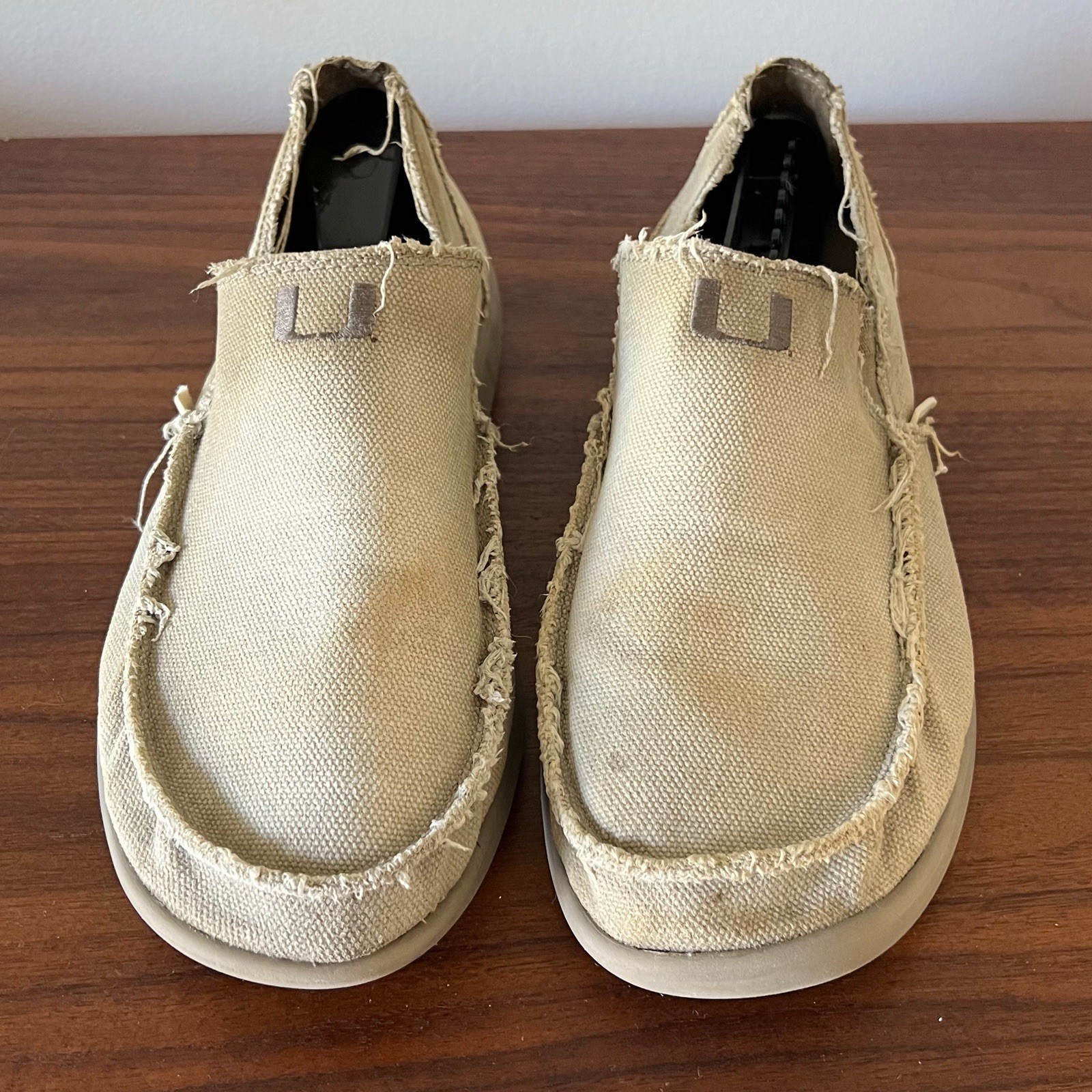 Crocs Men’s Miami Hurricanes Avast Shoes are casual tan canvas slip-on boat loafers in size 12. These shoes feature a round toe shape, standard shoe width, and a cushioned, lightweight, and comfortable design with breathable and slip-resistant features. The outsole is made of rubber, while the insole and lining materials are also made of canvas. These loafers are suitable for travel, casual occasions, and different seasons, including winter, summer, fall, and spring. Condition: Sun Faded throughout. Otherwise in good condition