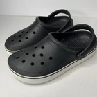 These are Crocs Off Court clogs in black, size 9 for women (size 7 for men). They are slip-on sandals with a low heel height, featuring a logo accent and ankle strap for comfort. The shoes are lightweight and suitable for travel, activewear, or casual occasions, with a rubber outsole and synthetic lining and upper material. Perfect for outdoor activities in all seasons.