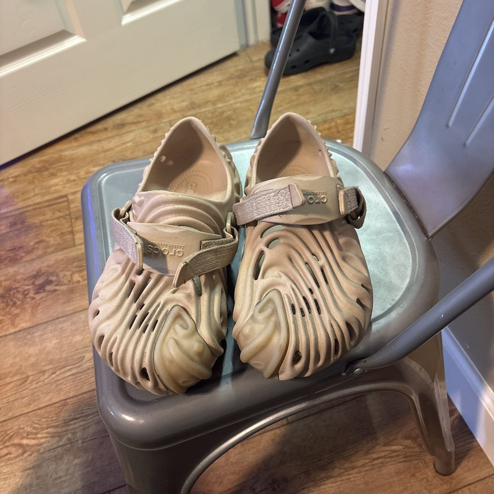 Crocs Pollex Clog by Salehe Bembury in the rare Horchata colorway. These highly sought-after clogs feature a distinctive, fingerprint-inspired design from renowned designer Salehe Bembury, offering both unique style and Crocs' signature comfort. Lightweight and comfortable for everyday wear. Excellent pre-owned condition with minimal signs of wear. A true collector's item and a statement piece for any footwear enthusiast.