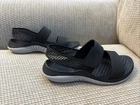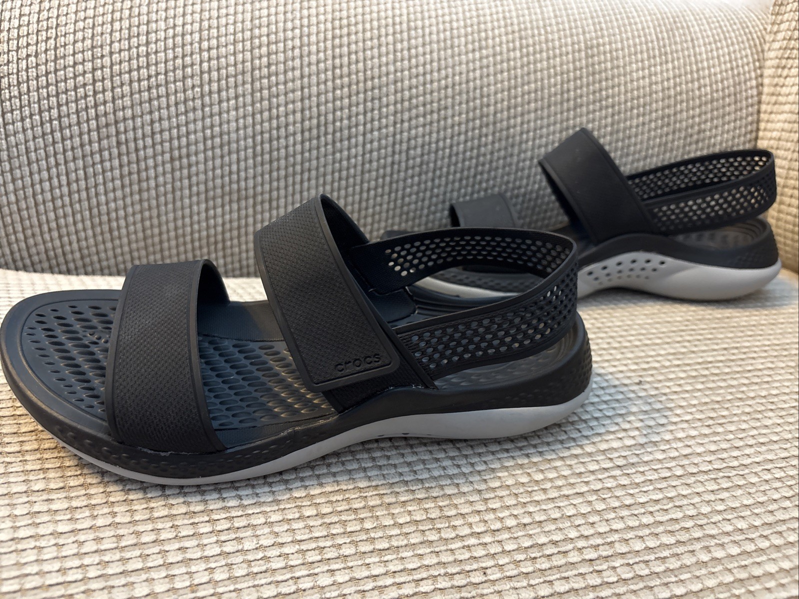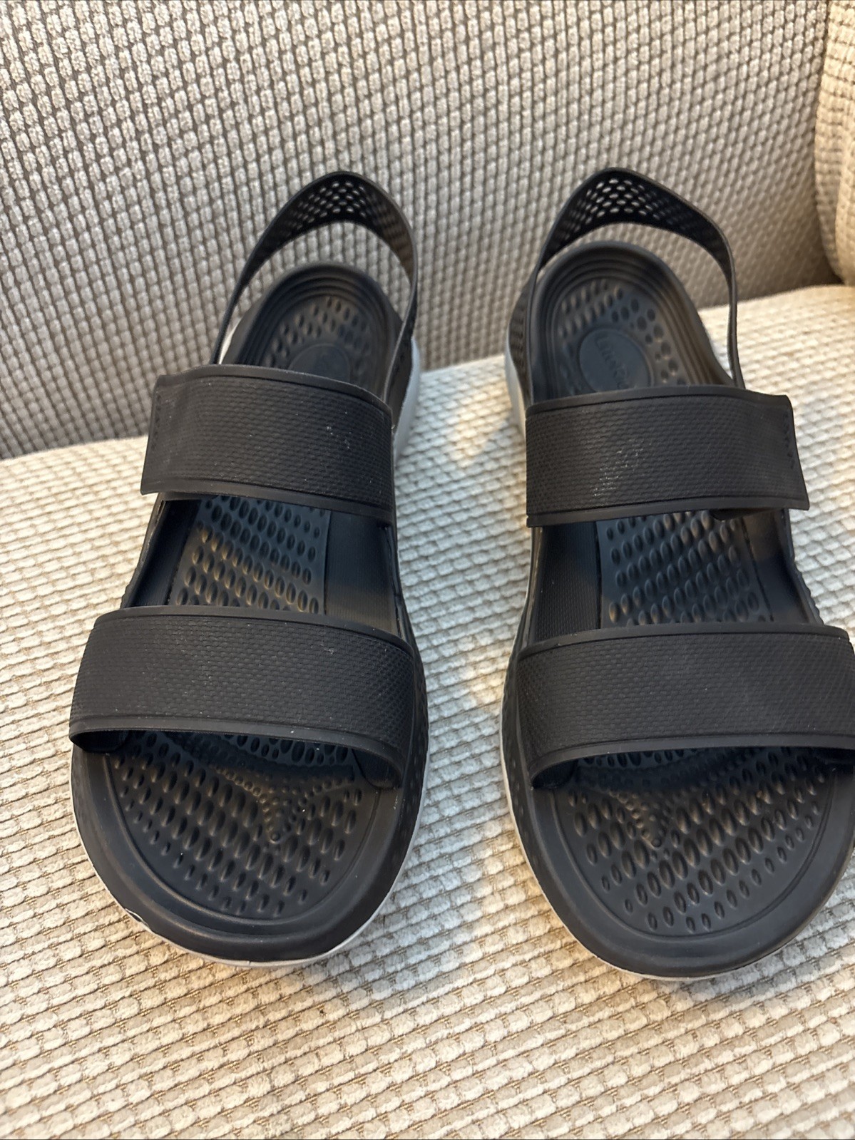 Slip into comfort with these black Crocs Slingback Lite Ride Sandals in size 6. Designed with a solid pattern and hook & loop closure, these sandals are perfect for travel and casual occasions. The low heel height and flat style offer a comfortable fit, while the rubber outsole and synthetic upper material provide durability and breathability. These open toe sandals also feature straps and the Crocs logo as accents. Ideal for women who value comfort and style, these sandals are a great addition to any wardrobe. Don't miss out on the chance to own these pre-loved sandals in excellent used condition.