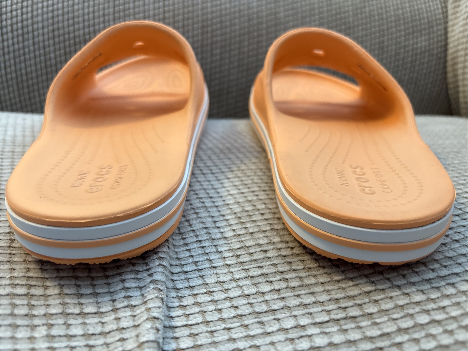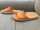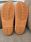 The Crocs Iconic Comfort Slip On Sandals in orange are designed for both women (size 7) and men (size 5). The sandals feature a single strap closure, holes on the top for breathability, and a flat heel style for under 1 inch in height. Made with man-made materials, these slip-on sandals provide comfort with a synthetic upper and a man-made insole. Perfect for travel or casual wear during the summer, fall, or spring seasons, these Crocs Slide Sandals are a classic and versatile choice for everyday use.